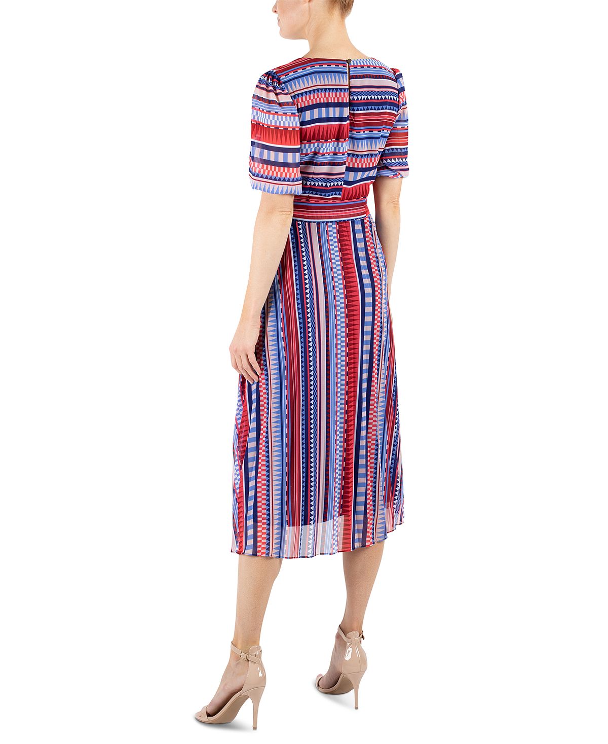 Fresh and vibrant| julia jordan's A-line midi dress captivates with a mix of stripes and colorful printed details.| Approx. 46 long from center back neck to hem. Length is based on size 6 and varies 1/8 between sizes| Surplice V-neck; A-line silhouette | Hidden back zip closure; button closure at back keyhole| Removable matching fabric belt at waist