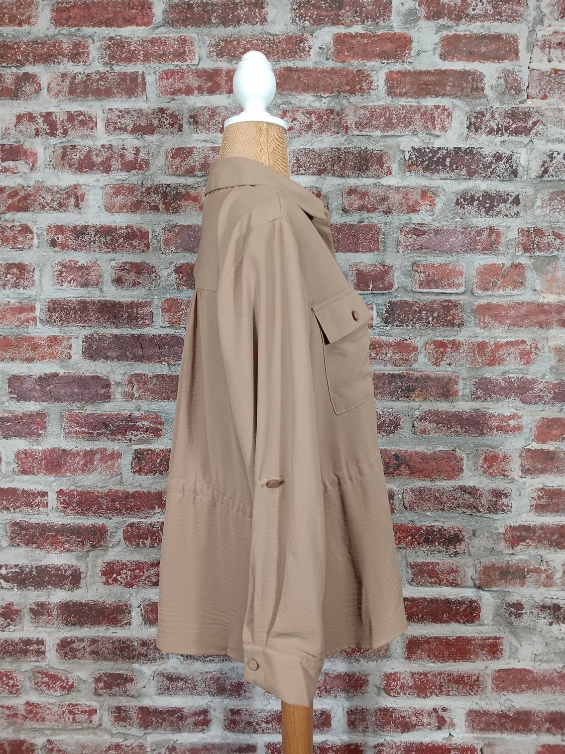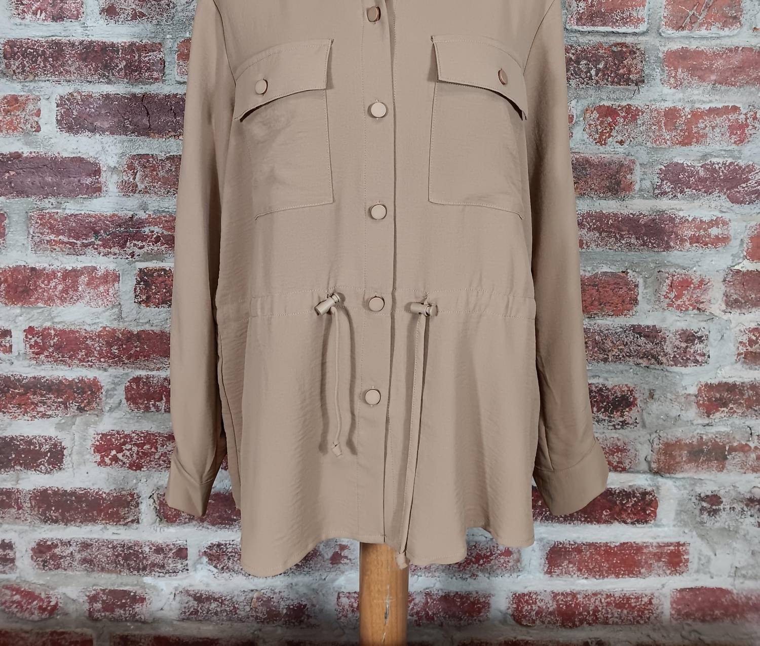 The coolest, most versatile utility jacket. Match it with your favorite pair of denim or throw it over any day dress. Elevate your outerwear collection with the Women's Drawstring Jacket by K&C Clothing, a chic addition in a warm Camel hue. This utility jacket features long sleeves with button-up detailing and a practical drawstring waist for a flattering fit. Made from durable polyester, it offers a solid pattern and button closure, making it both fashionable and functional. Care instructions recommend hand washing and line drying to maintain its quality.