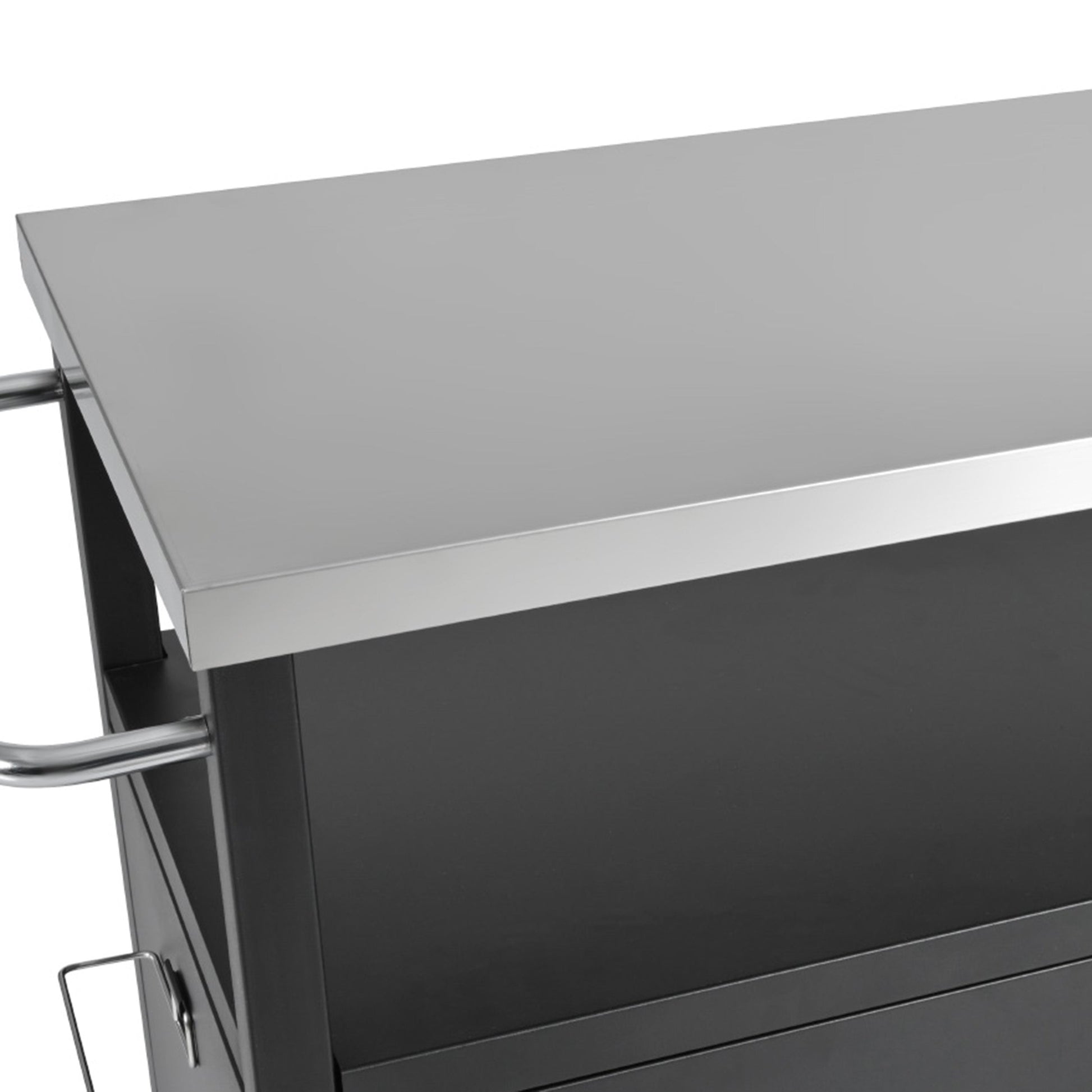 - Includes a storage cabinet, spice rack, towel rack, and four lockable wheels for easy mobility