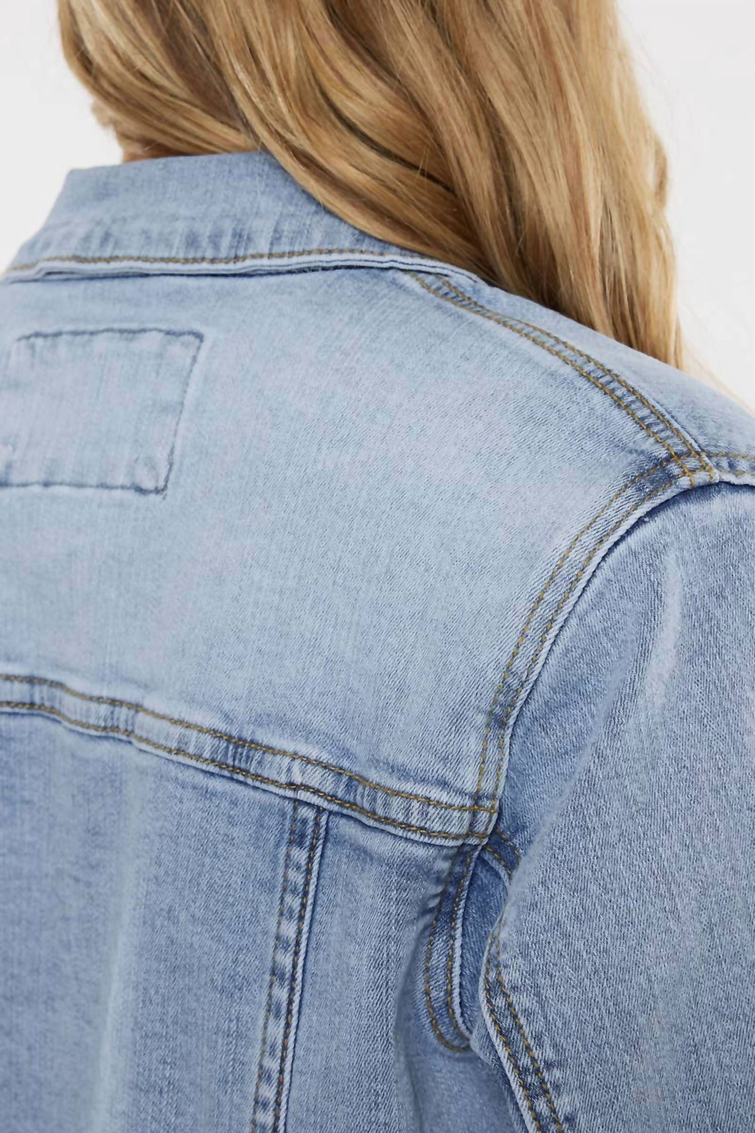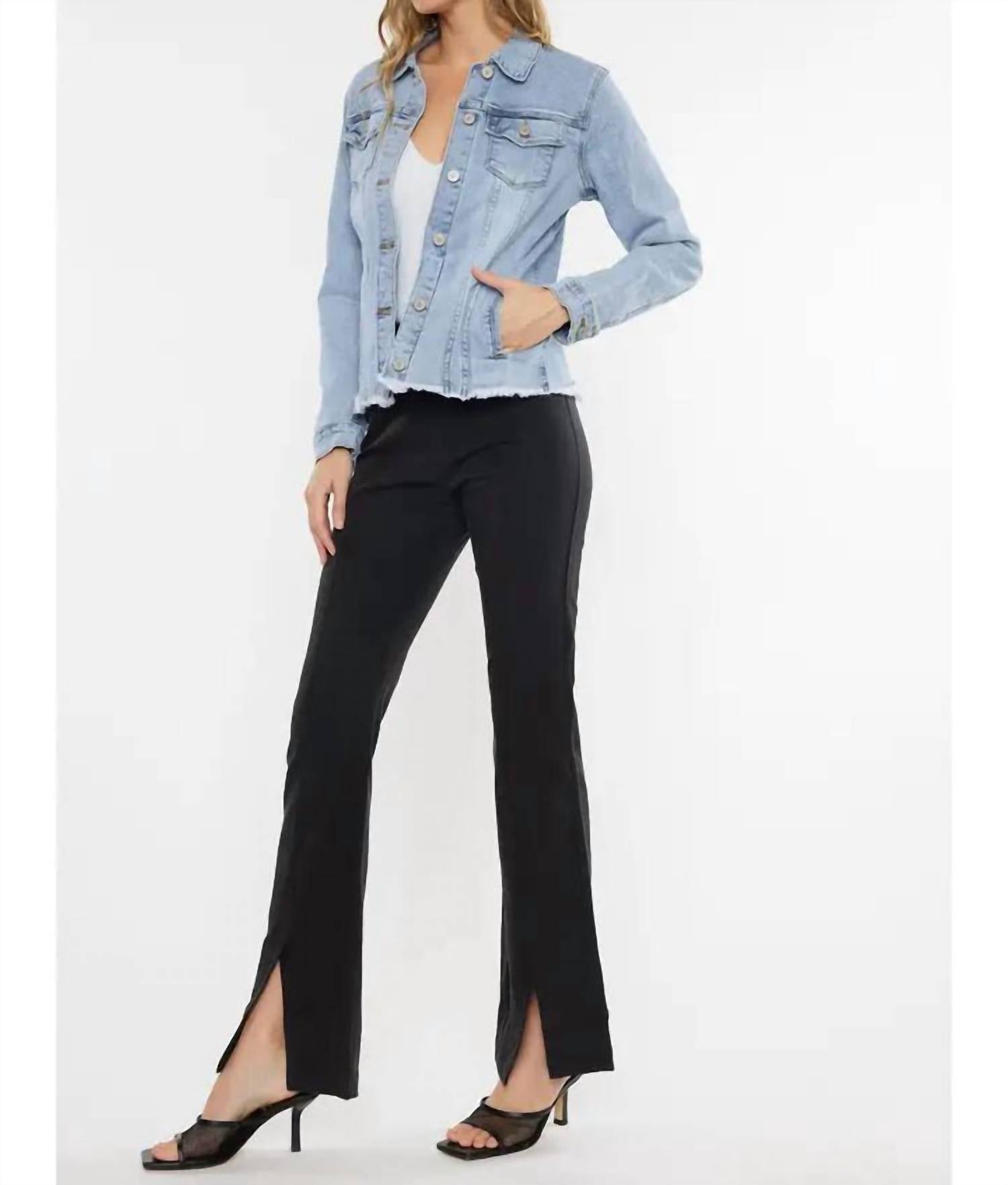A jacket so versatile you can literally wear it with anything. Introducing the Frayed Hem Denim Jacket by KanCan, a stylish addition to any wardrobe with its trendy light wash and frayed detailing. Designed for women, this jacket features long sleeves and a classic collar for a timeless appeal. Crafted from a durable cotton blend, it includes functional pockets and a secure button closure. Its solid pattern ensures versatility, making it suitable for various occasions.