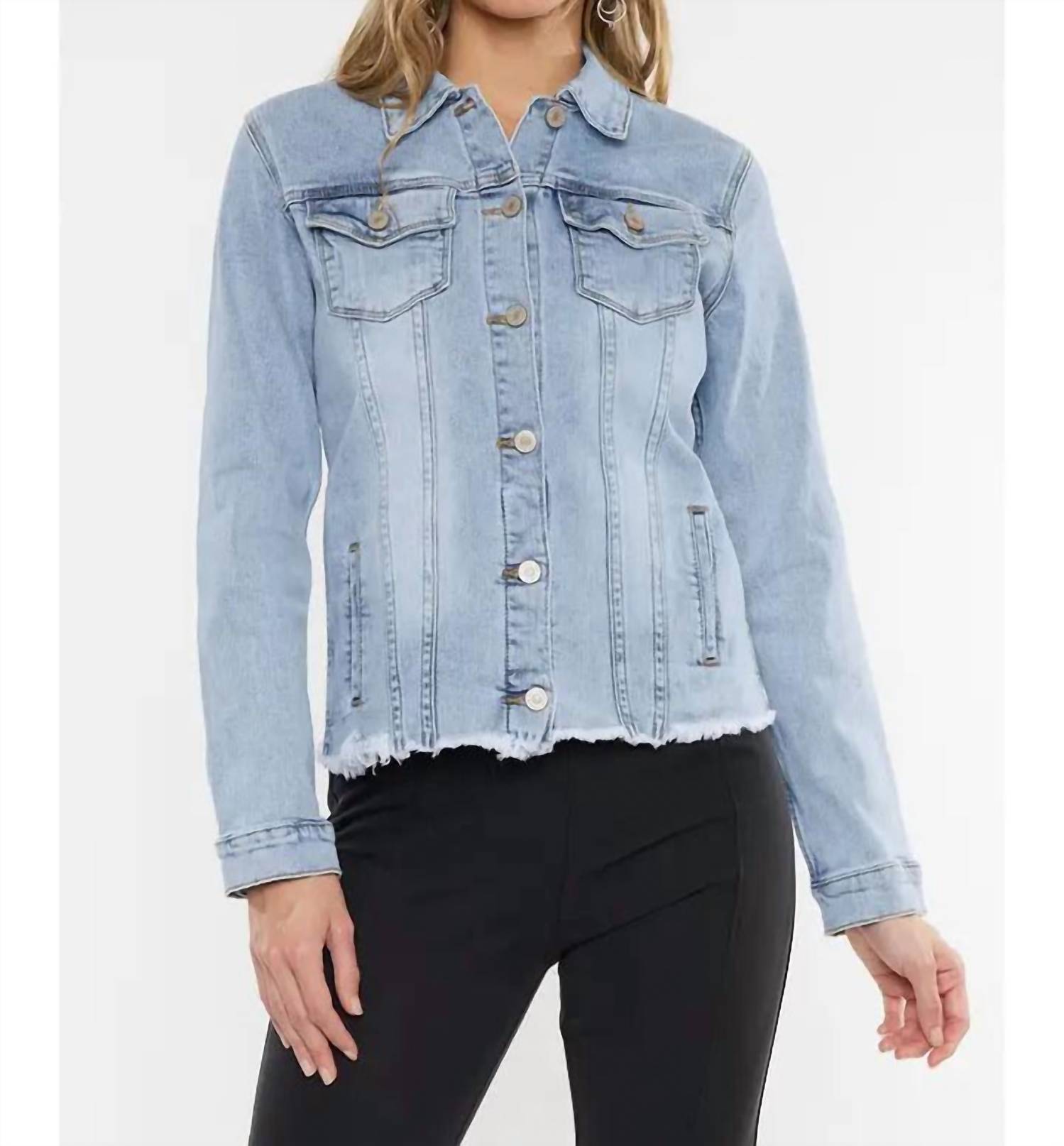 Introducing the Frayed Hem Denim Jacket by KanCan, a stylish addition to any wardrobe with its trendy light wash and frayed detailing. Designed for women, this jacket features long sleeves and a classic collar for a timeless appeal. Crafted from a durable cotton blend, it includes functional pockets and a secure button closure. Its solid pattern ensures versatility, making it suitable for various occasions.