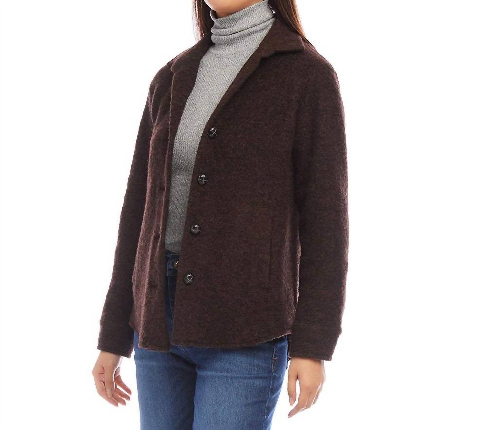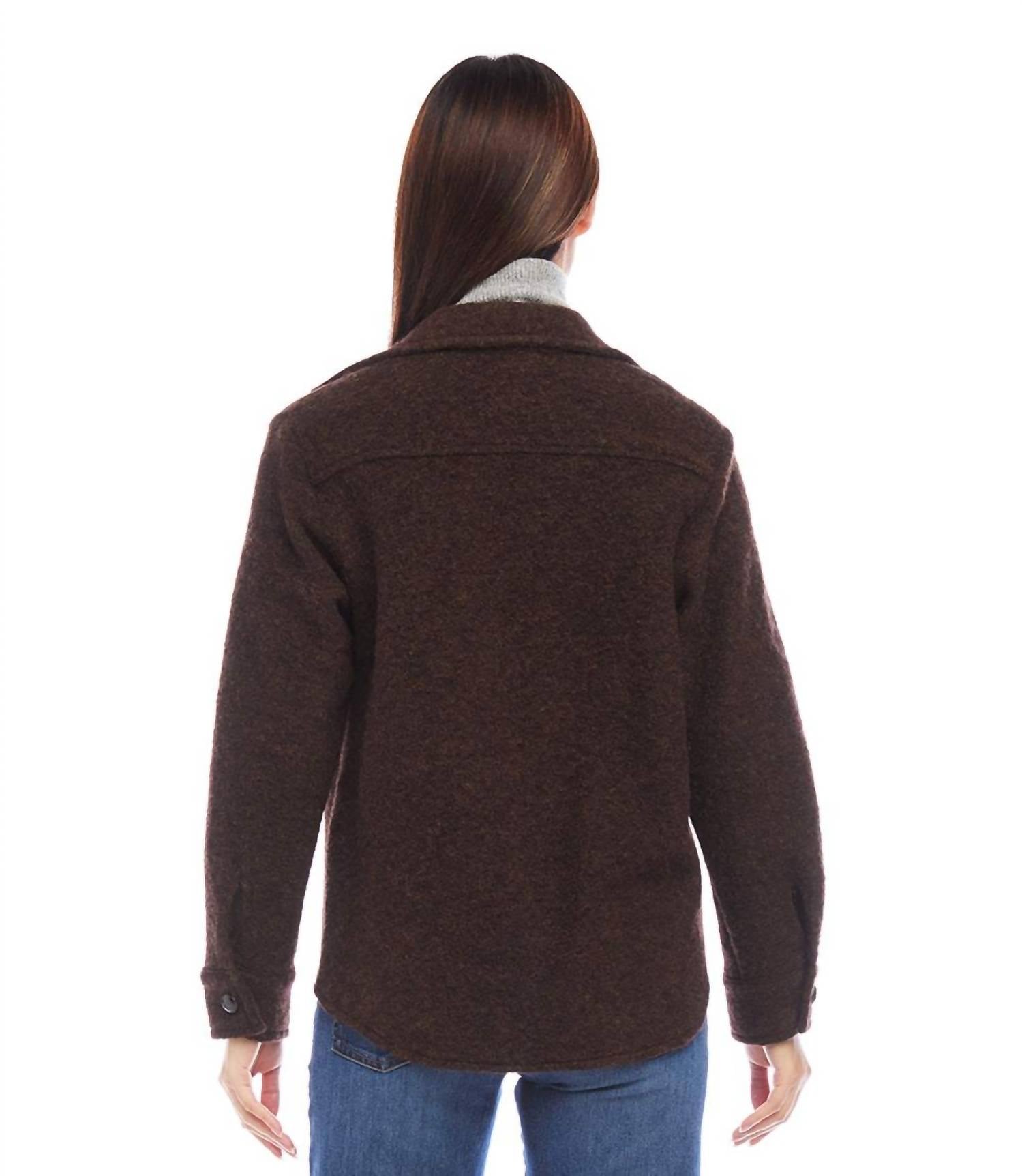 The Karen Kane Women's Brushed Shirt Jacket is a stylish choice for fall gatherings, showcasing long sleeves and a sophisticated solid brown pattern. Composed of a luxurious 56% wool, 40% polyester, and 4% acrylic blend and crafted in the USA from Italian fabric, this jacket offers a garment length of 29 1/8 inches for size M. Featuring a button front closure with elegant faux leather buttons and practical front welt pockets, this unlined piece ensures both functionality and flair. Care instructions indicate dry cleaning to maintain its premium quality.