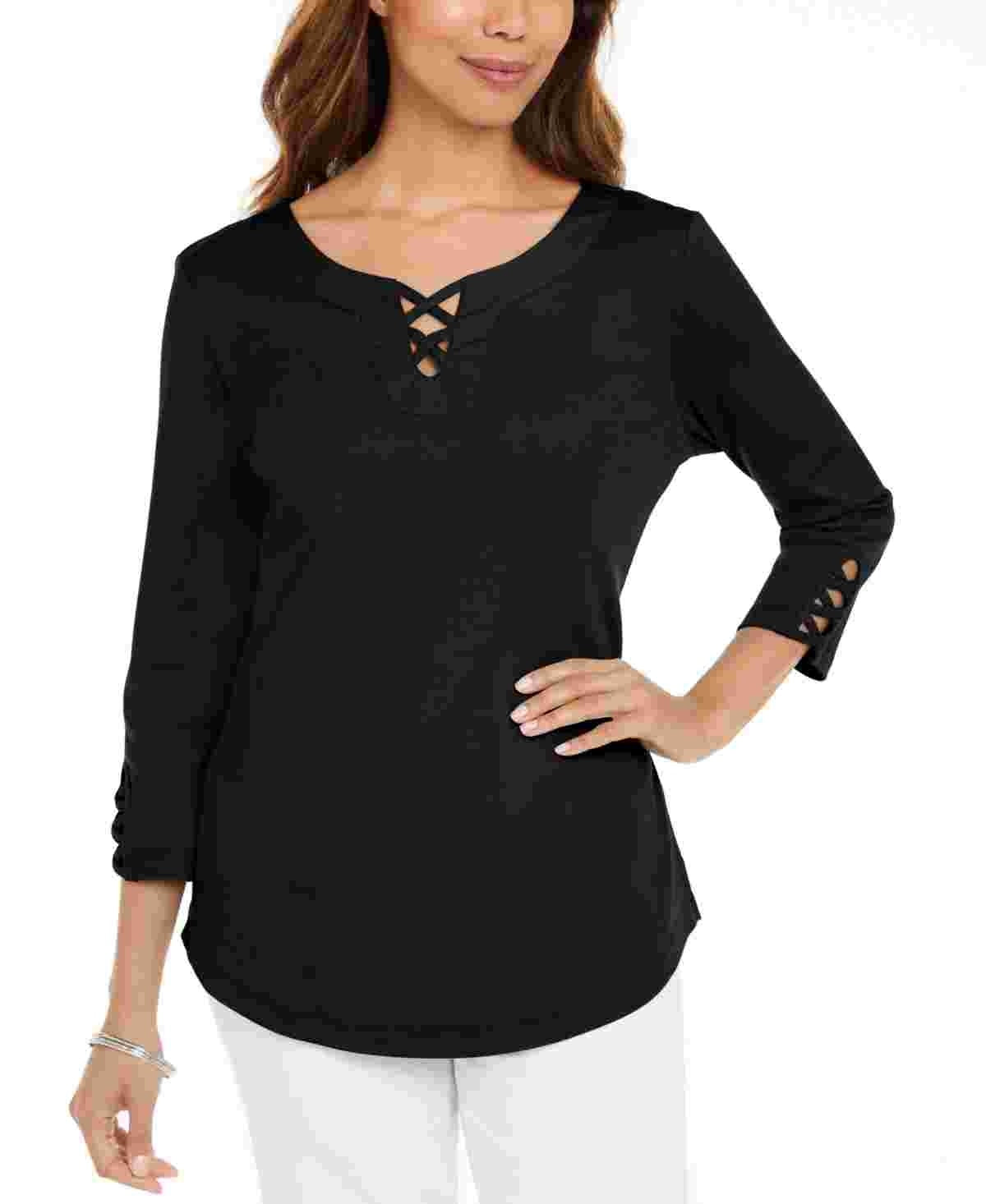 Karen Scott Women's Cotton Lace Up T-Shirt Black Size Small