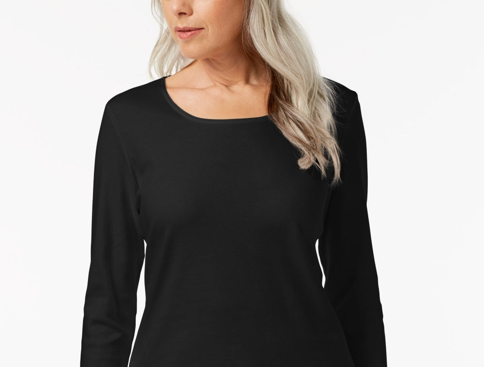 Hits at hip|Designed to fit and flatter 5'4 and under frame|Scoop neckline|3/4-sleeves|All cotton