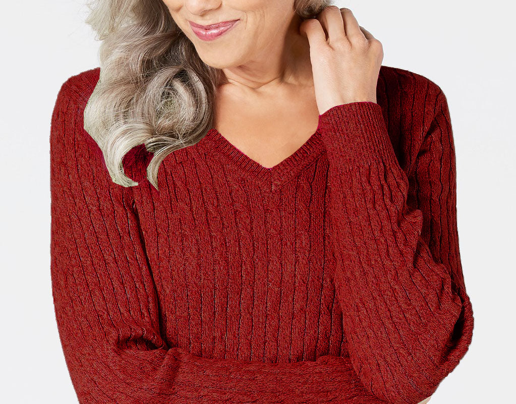 Hits at hip; fitted; approx. length: 25"| Cable-knit style|V-neck|Cable-knit style