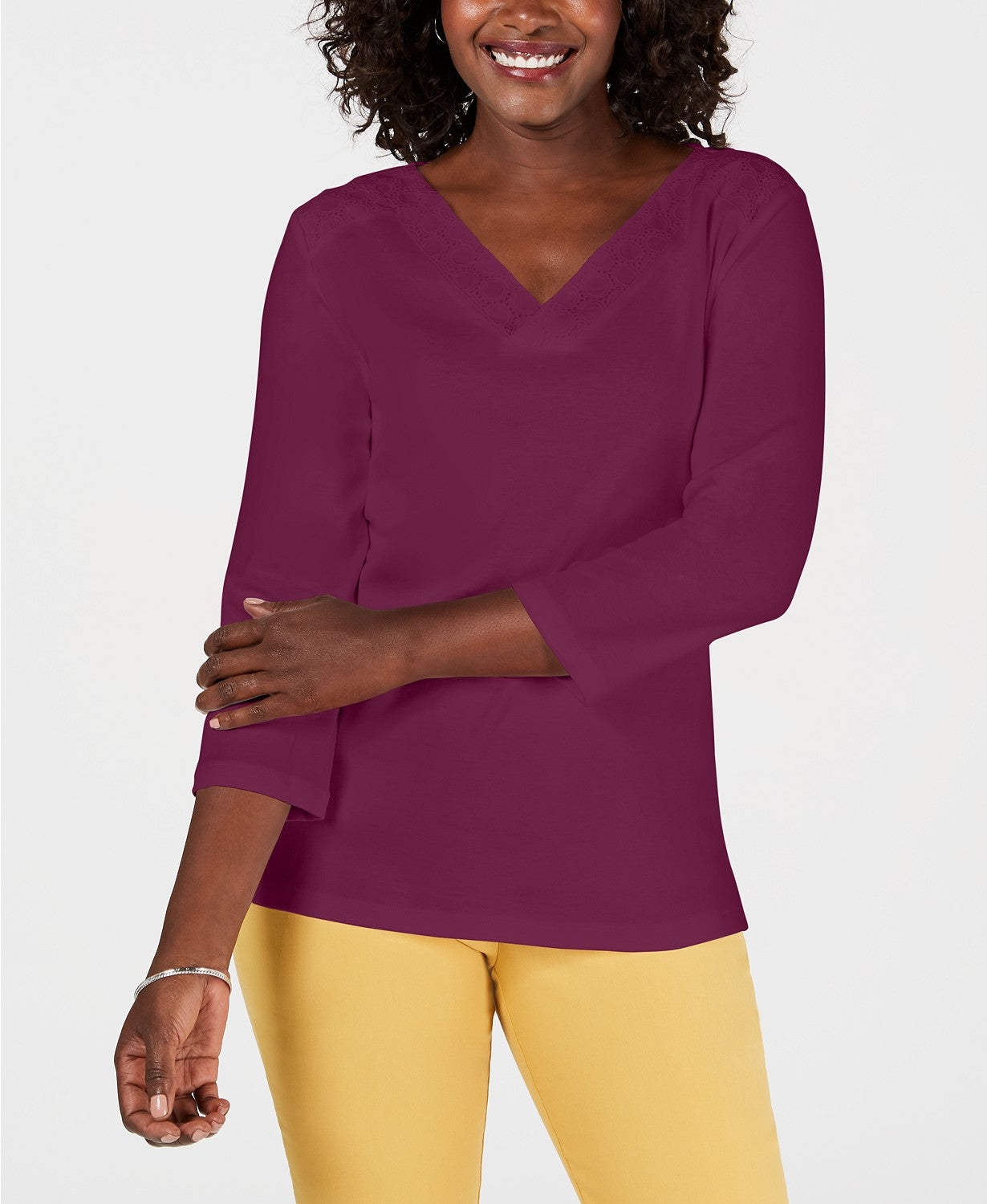 Karen Scott Women's Eyelet-Trim Top Dark Pink Size Small