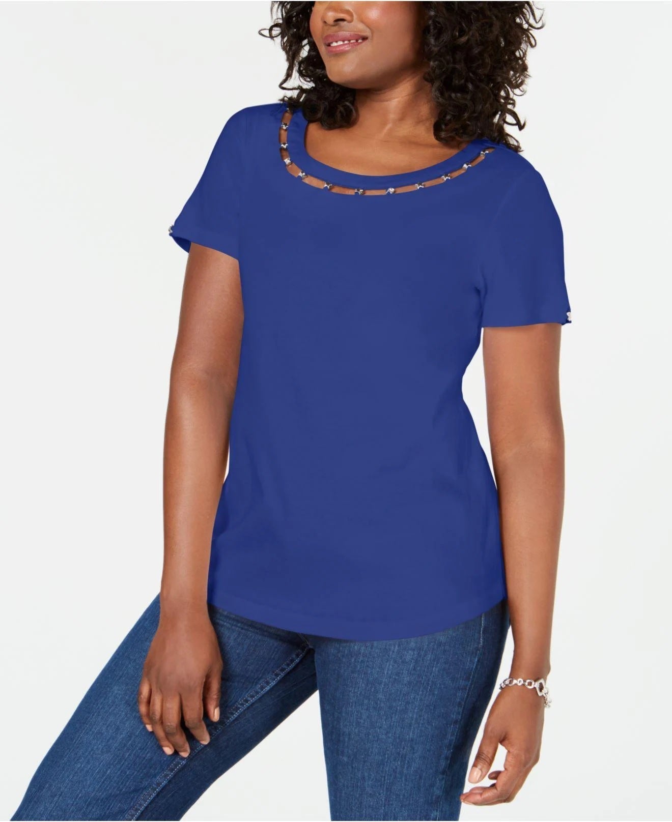 Karen Scott Women's Lattice Neck Embellished Cotton Top Blue Size Medium
