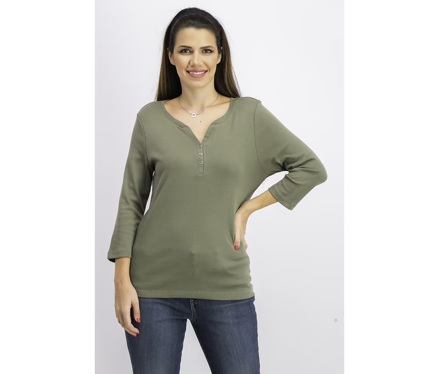 Loose fit|Designed to fit and flatter 5'4 and under frame|Henley neckline with buttons|All cotton|Machine washable
