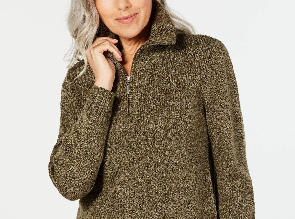 Relaxed fit; hits at hip; approx. 23-1/2" long|Due to generous sizing, we suggest sizing down for the perfect fit|Designed to fit and flatter 5'4" and under frame|Stand collar; quarter-zip closure|Marled knit|Acrylic/polyester