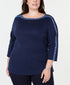 Relaxed fit; hits at hip; approx. 28" long from center back neck|Boat neckline|Contrast stripe with studs at neckline, sleeves|3/4-sleeves