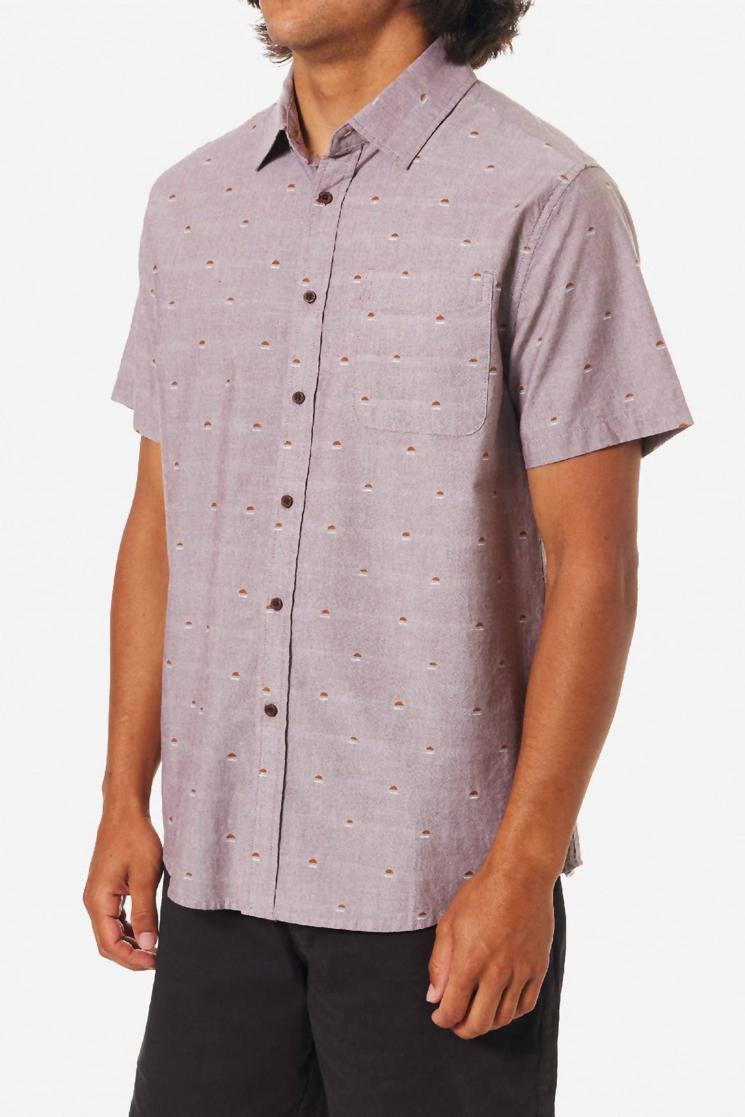 Introducing the Sunset 2 Short Sleeve Woven by Katin in Rum, perfect for a casual yet stylish look. Crafted from 100% cotton chambray, this shirt features a custom-clipped dobby sunset design, adding a unique texture and pattern. The button-up front and standard fit ensure comfort, while the left chest pocket adds functional detail. Care instructions: Hand wash.