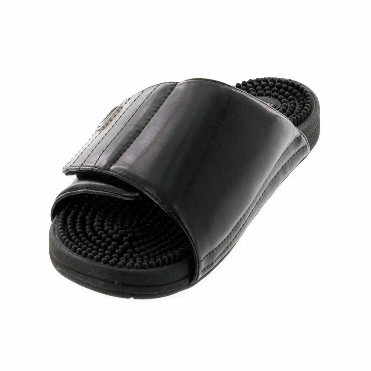 Flowy dresses, cropped pants, and even jumpsuits... this sandal works with them all! Step into comfort and healing with the Women's Soul V Sandal by Kenkoh, a versatile summer choice for the modern woman. Crafted in sleek black leather, this sandal features an open toe design and a flat heel, ideal for streetwear enthusiasts. The standout feature of the Kenkoh footbed includes over 1,000 rubber latex nodules that massage and stimulate pressure points, helping to improve circulation and alleviate symptoms like leg cramps and plantar fasciitis. Closure is a single, broad adjustable Velcro strap for maximum flexibility, making it perfect for all-day wear.