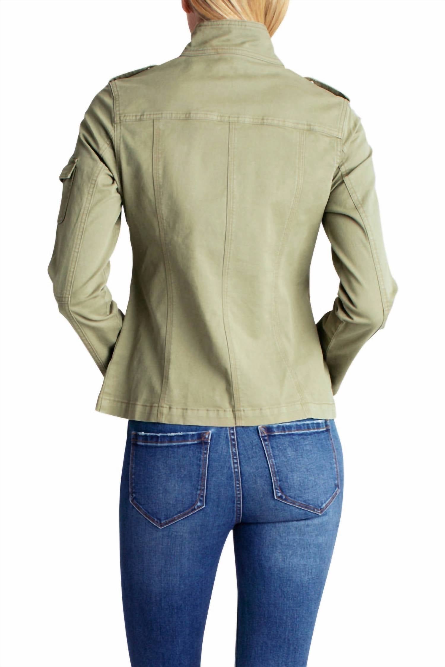 The ultimate cool-girl utility jacket. This utility jacket features long sleeves and is made from a durable cotton blend, composed of 98% cotton and 2% spandex. Its hue brings a vibrant touch to your wardrobe. Designed with a snap closure and practical pockets, this piece effortlessly combines practicality with contemporary style.