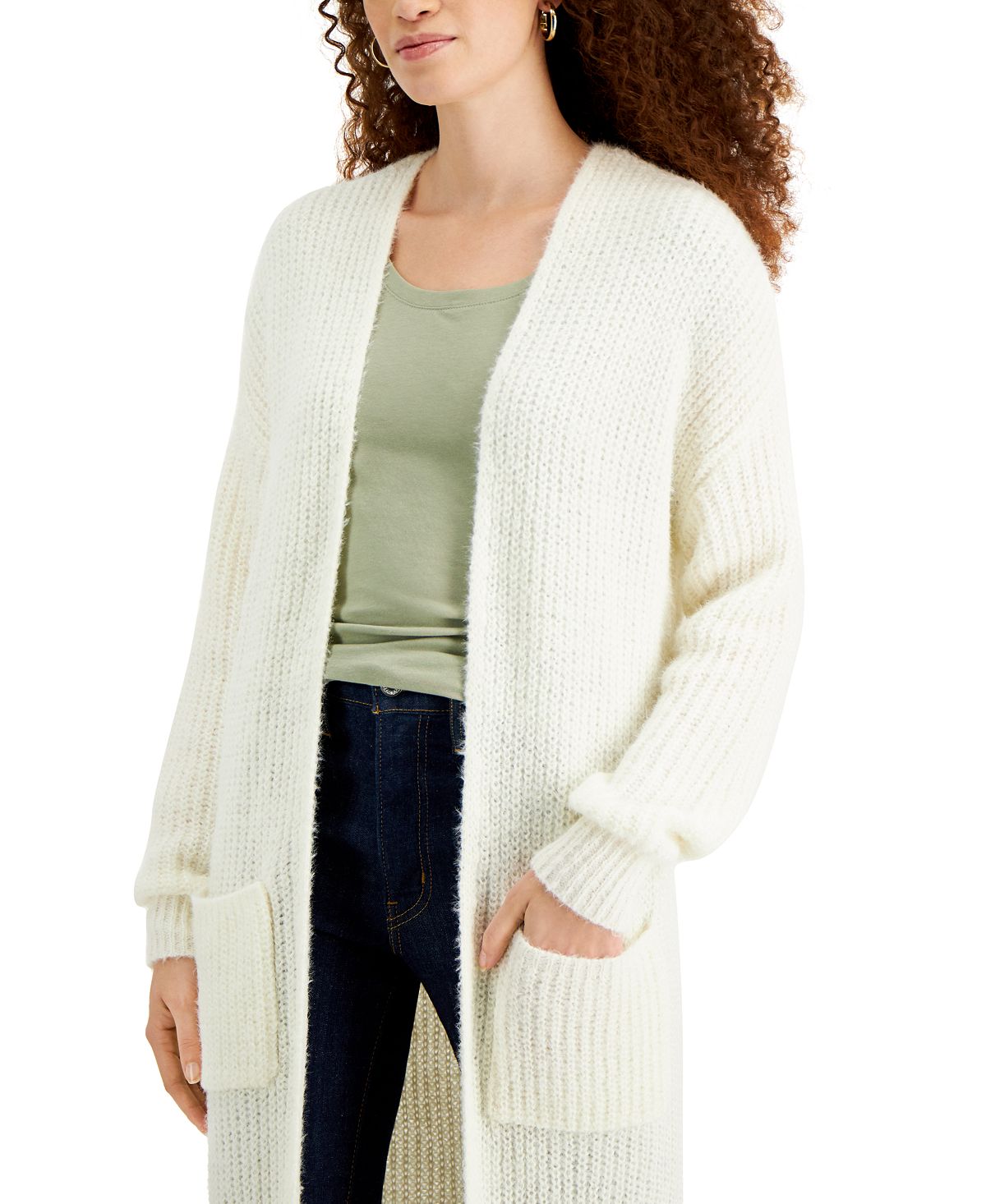 Open front| Fuzzy finish; two patch pockets at front| Polyester