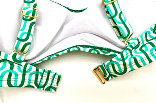 Continuous underwire support | Vibrant green color | Geo print design | Adjustable straps | Lightly padded cups | Secure hook closure | Durable fabric | Size S