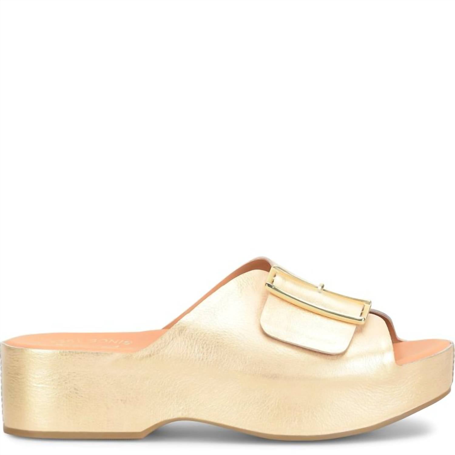 Flowy dresses, cropped pants, and even jumpsuits... this sandal works with them all! This leather sandal has a 1 3/4-inch heel, a 1-inch platform, and a 3/4-inch heel slope. It features a shiny buckle hardware on the strap, a cushioned footbed, and a lightweight rubber sole. The upper is made of leather, with textile lining, and it is imported.