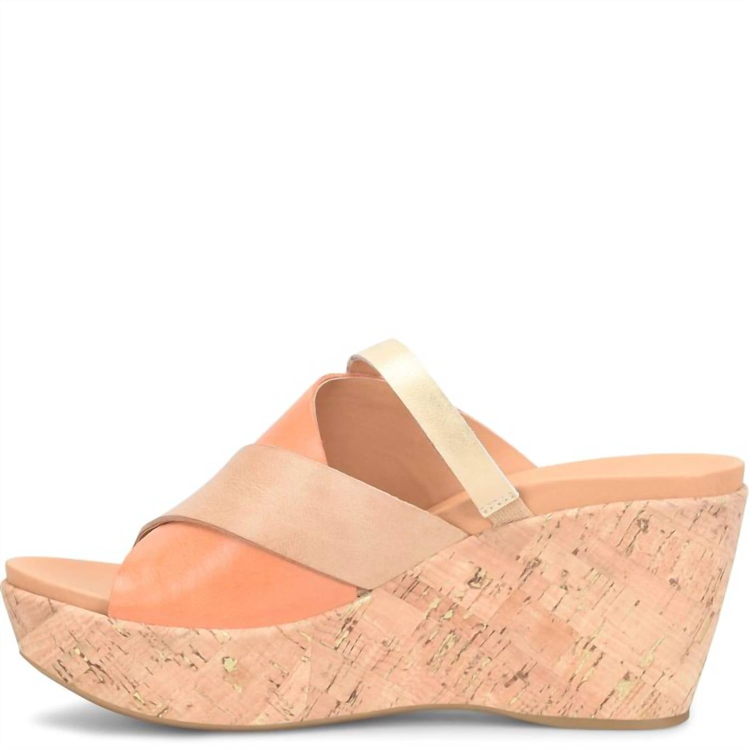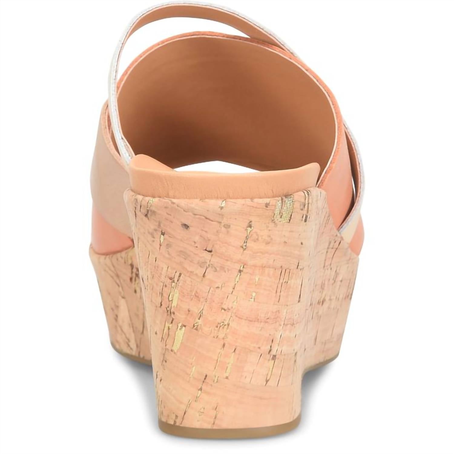 Flowy dresses, cropped pants, and even jumpsuits... this sandal works with them all! Step into style with the Women's Addie Sandal by KORK-EASE, showcasing a chic colorblock design in Orange Fanta Butterfly. Crafted from a combination of Italian soft hand-finished leather and metallic leather, these sandals feature an open toe design perfect for summer occasions. Enjoy the comfort of a cushioned microfiber covered footbed, complemented by a breathable soft micro fiber lining. The high-traction lightweight rubber outsole, with its self leather-wrapped wedge heel measuring 3.25 inches and a platform height of 1.25 inches, ensures both stability and elegance.