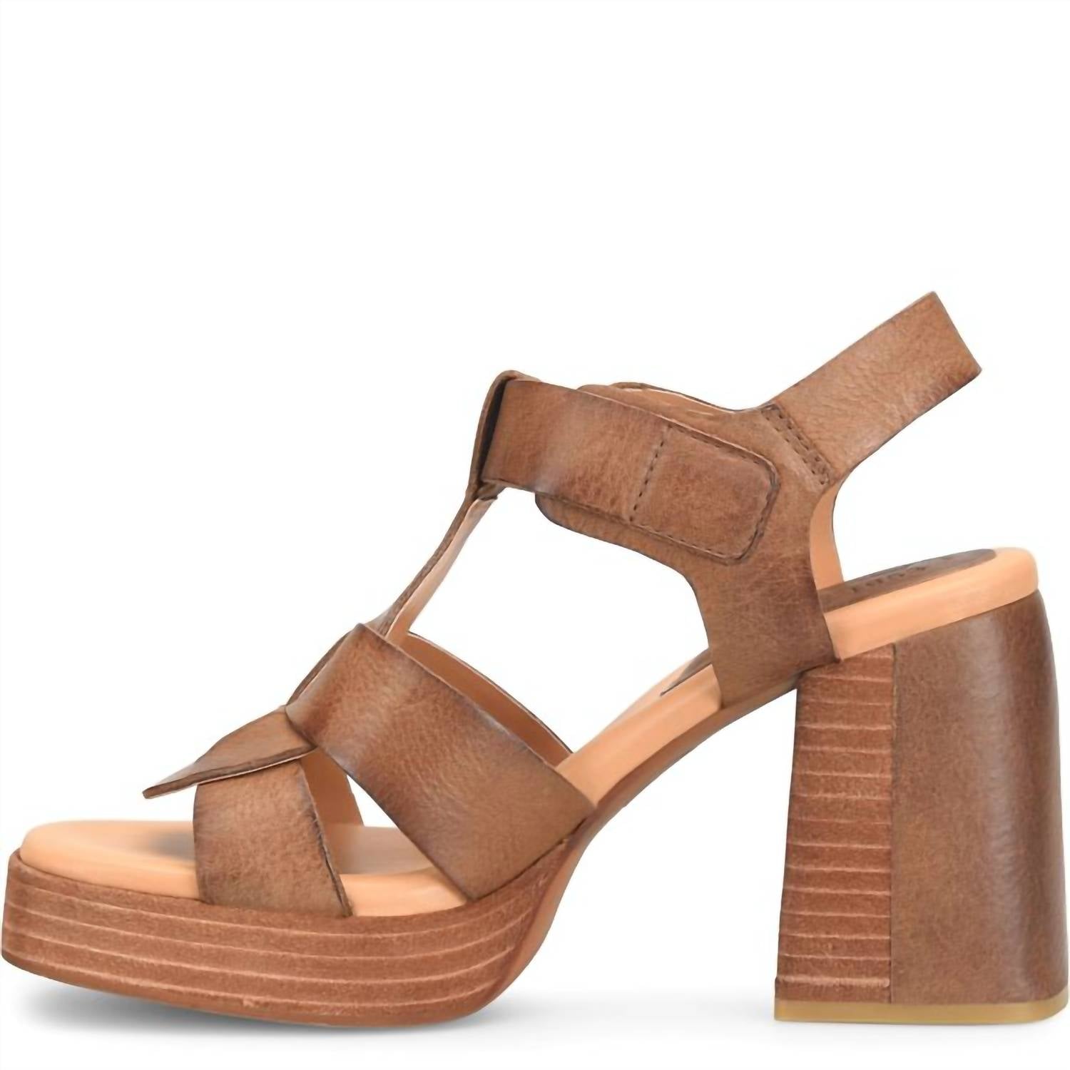 Introducing the Women's Macey Sandal by KORK-EASE, a stunning addition to your summer wardrobe that combines retro charm with modern elegance. This sandal, available in a sophisticated brown, is crafted from soft hand-finished Italian full grain or metallic leather, featuring an open toe design perfect for evening events. With a comfortable cushioned microfiber footbed and a high-traction lightweight rubber outsole, it boasts a 3.5-inch heel and 1-inch platform for a stylish lift. The Macey Sandal is a minimalist choice ideal for Thanksgiving festivities, offering both comfort and a chic, unforgettable look.