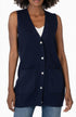 Discover the Avalon Cardigan Sweater Vest by KUT FROM THE KLOTH, offering a perfect layering solution throughout the year. This versatile piece features a sleeveless design, composed of 43% polyester, 33% acrylic, 17% wool, and 7% other fibers, and is crafted in a longer length for a flattering fit. It boasts a button closure and handy front patch pockets, perfect for travel and workwear in the fall. Care for this imported, solid navy vest by hand washing cold, laying it flat to dry, and ironing on low heat if necessary.