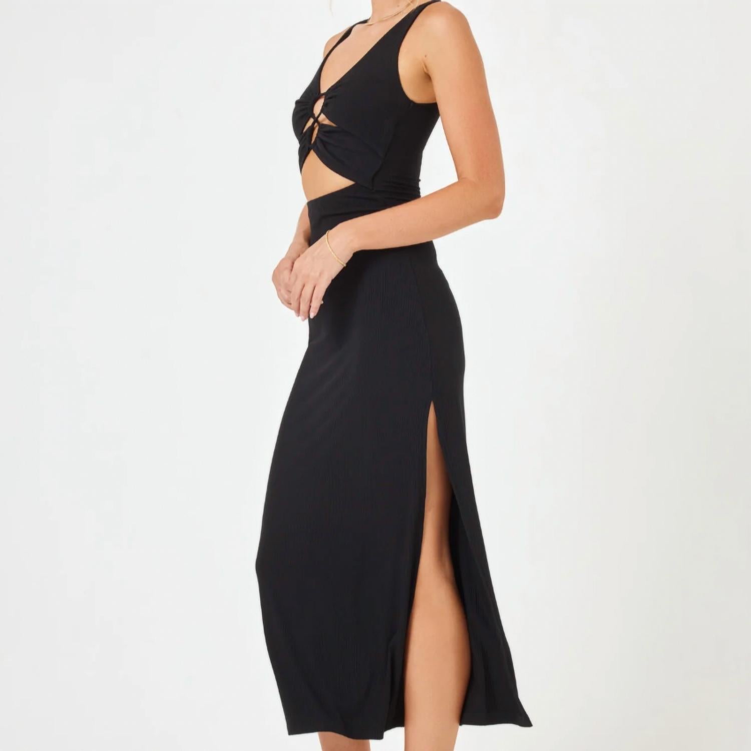 Just add slides or mules and you are good to go. Introducing the Camille Cutout Detail Dress by L*SPACE, a sophisticated choice for any black-tie affair. This sleeveless dress boasts a bodycon silhouette, scoop neckline, thick straps, and stylish loop cutouts at the waist for a refined yet modern look. Crafted from 92% Viscose and 8% Elastane, its fitted ankle-length skirt ensures a sleek line. Closure: Pull on. Care: Hand wash and lay flat to dry.