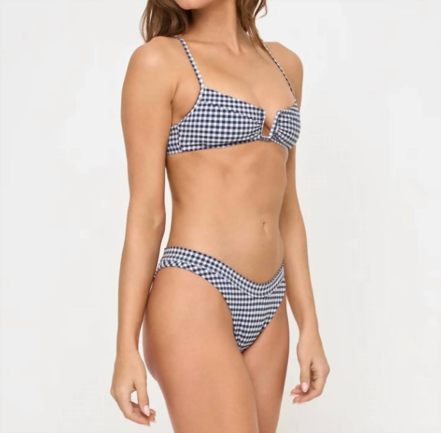 Dream of your next beach getaway in this cute little number. Pair with strappy sandals, a floppy hat, and an oversized tote to complete the perfect vacation look. Turn heads with the L*SPACE Peyton Bikini Top in Atta Girl Gingham, perfect for a chic summer beach day. This bralette bikini top combines a stylish u-wire front with adjustable spaghetti straps for a customized fit and medium support. The hook closure at the back ensures secure wear, while the 42% Nylon, 47% Polyester, 11% Spandex blend allows for a comfortable stretch. Remember to hand wash this bikini top to maintain its vibrant gingham pattern.