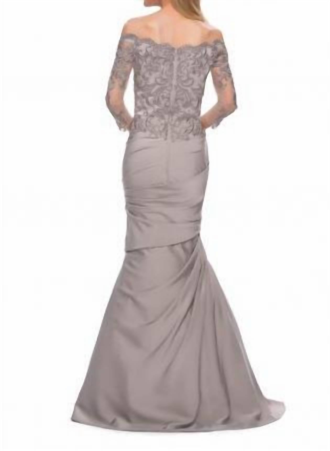 Step into elegance with the Women's Satin Mermaid Gown by La Femme, perfect for your next evening event. This sophisticated gray gown is crafted from luxurious satin, featuring a minimalist textured design that enhances its mermaid silhouette. It showcases an off-the-shoulder neckline with short sleeves for a graceful fall look. Closure: Pull on.
