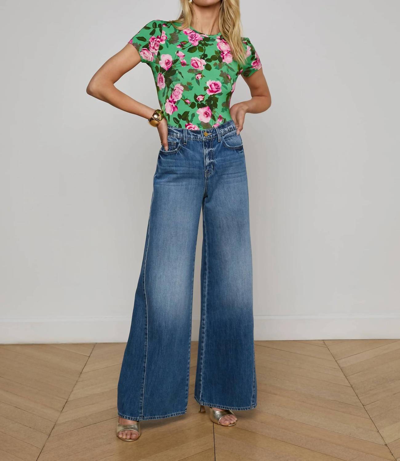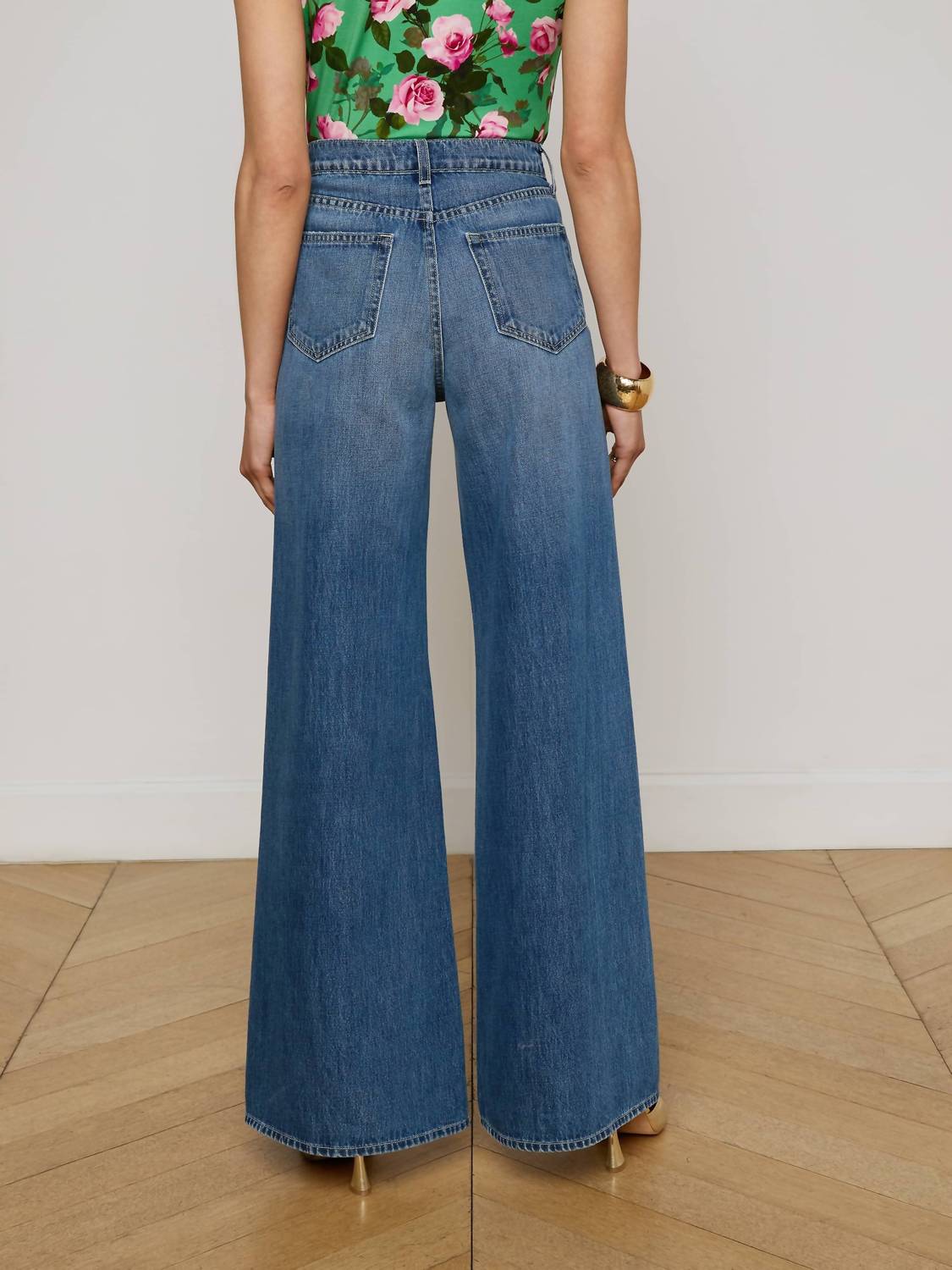 Just as cute as they are comfortable. Iconic piece making waves in the streetwear scene this fall. Crafted from 100% cotton denim. Offer a flattering high-rise and relaxed fit through the hips, cascading into wide legs with a trendy twisted seam. Complete with a classic five-pocket design and secure zip fly and button closure, promise both style and comfort. Care instructions advise machine washing. Model is 5'9" tall, with measurements 32" bust, 24" waist, 34" hips, wearing a size 25 with a 10.5" rise, 33" inseam, and 29" leg opening.