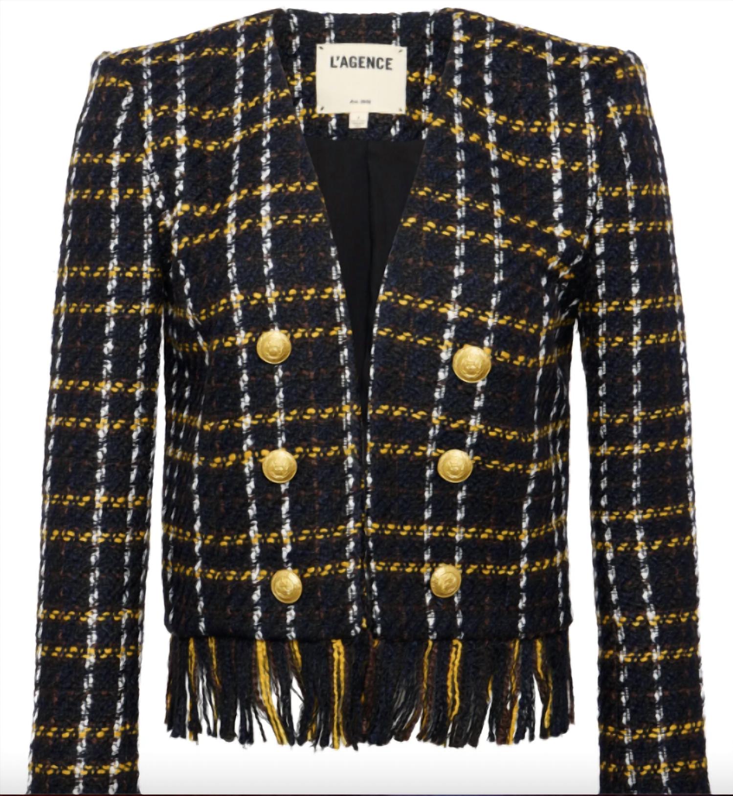 A blazer so versatile you can wear it to the office or pair it with jeans for a more casual look. Elevate your wardrobe with the Belmont Fringe Jacket by L'Agence, a striking piece in black and yellow plaid. This women's blazer features long sleeves and a chic V-neck for a sophisticated look. Made from high-quality polyester, this jacket boasts a 20-inch length. With its fringe detailing, it offers a unique twist on classic style, perfect for making a statement.