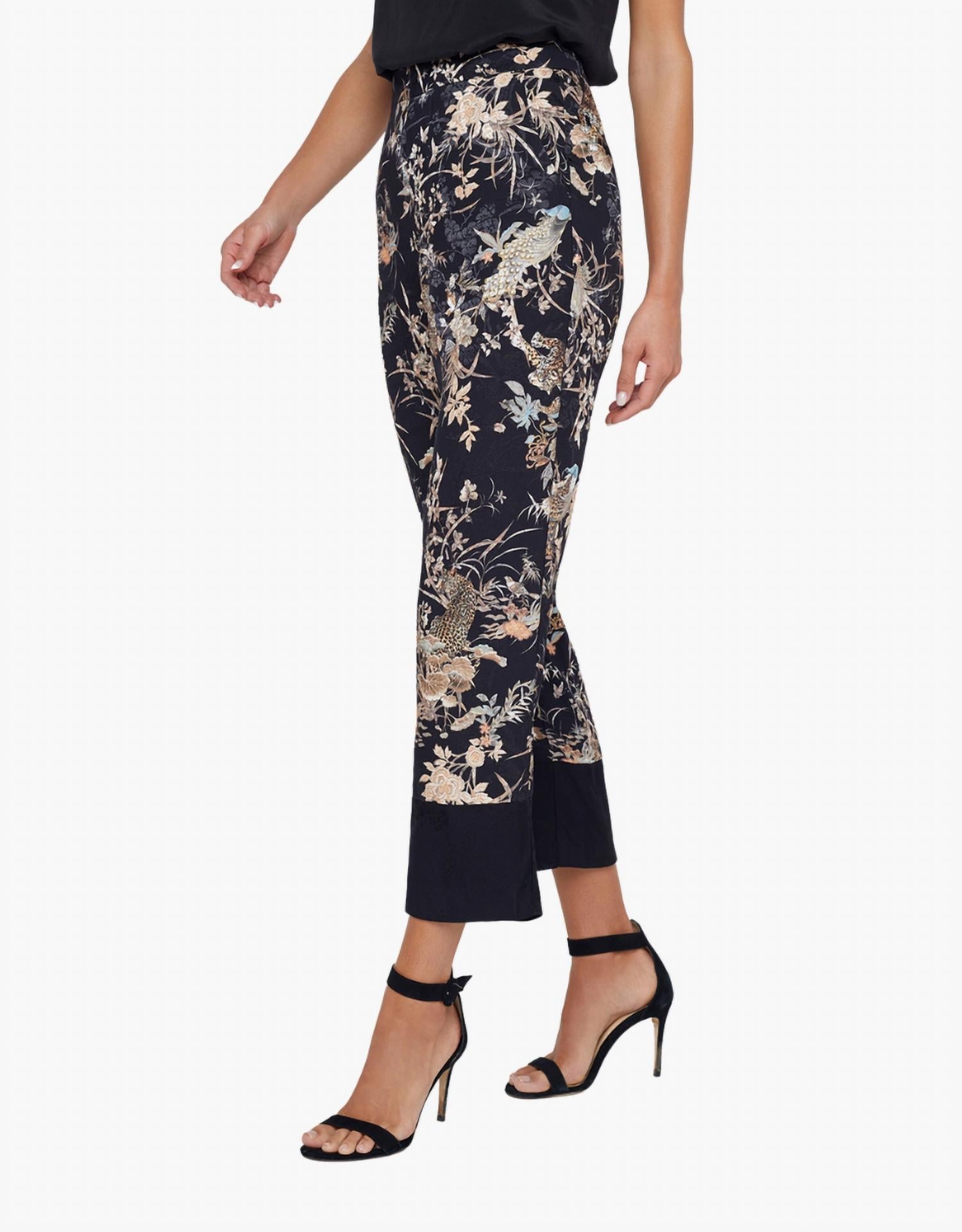 A straightleg pant that workes season after season. Dress these up with your favorite blouse or keep it casual with your go-to tee. Introducing the Carmina Cropped Trousers by L'Agence, a stunning addition to your wardrobe with a mid-rise and slim fit. These straight-leg trousers feature a captivating black multi tapestry jungle print, crafted from a luxurious blend of 52% Rayon and 48% Viscose. Made in the US, they offer a practical zip closure and functional pockets. Hand wash.