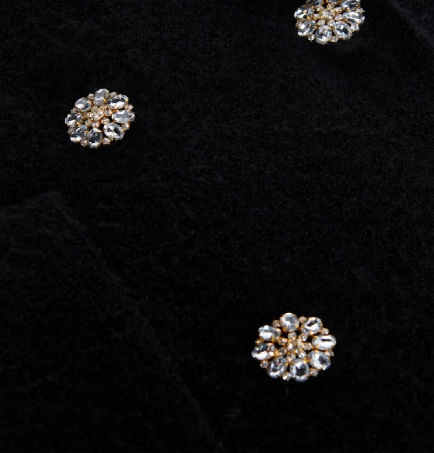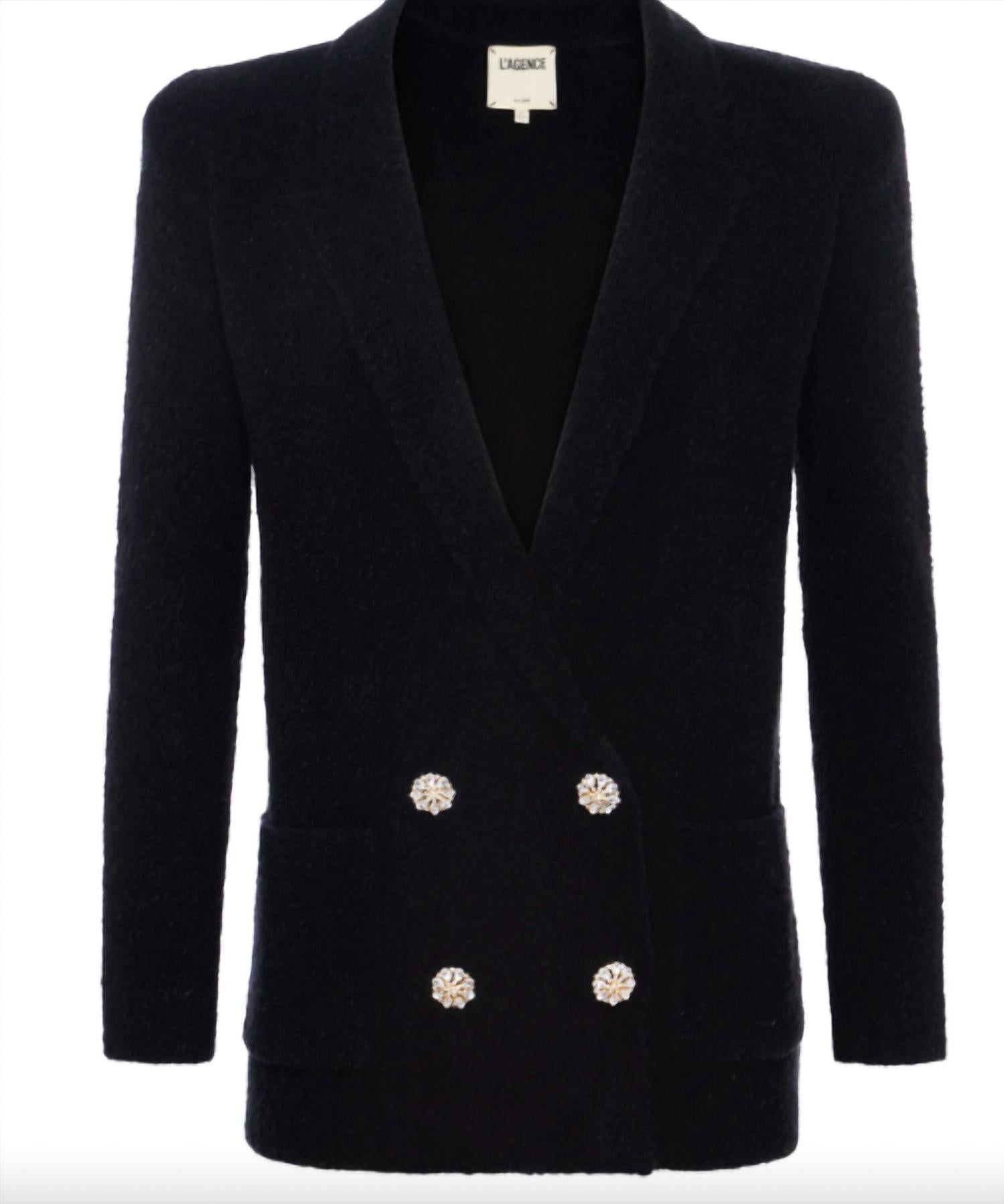 Elevate your wardrobe with the Eileen Knit Blazer by L'Agence, a textured piece in classic black designed for a chic, oversized fit. This women's blazer features long sleeves and a collared neckline, crafted from a stretch acrylic and wool-blend knit. Enjoy the practicality of pockets and a sophisticated button closure. For optimal care, dry clean only.
