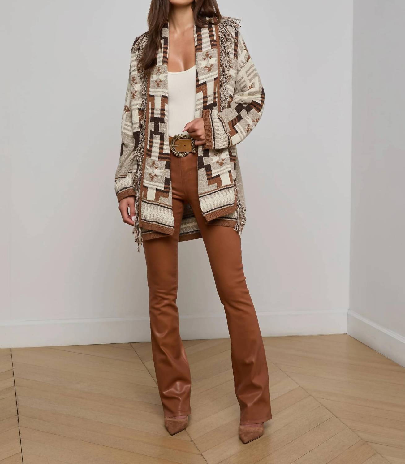 Embrace the boho-chic trend in Natural Multi. Long sleeve cotton jacquard cardigan features a bold geometric pattern, textured stitching, and fringe trim for a contemporary finish. With a pull-on style and practical patch pockets, perfect for layering in winter. Measuring about 30.8" from shoulder to hem, the model showcases it in a size XS (5'10" height, 32" bust, 24" waist, 34.5" hip).
