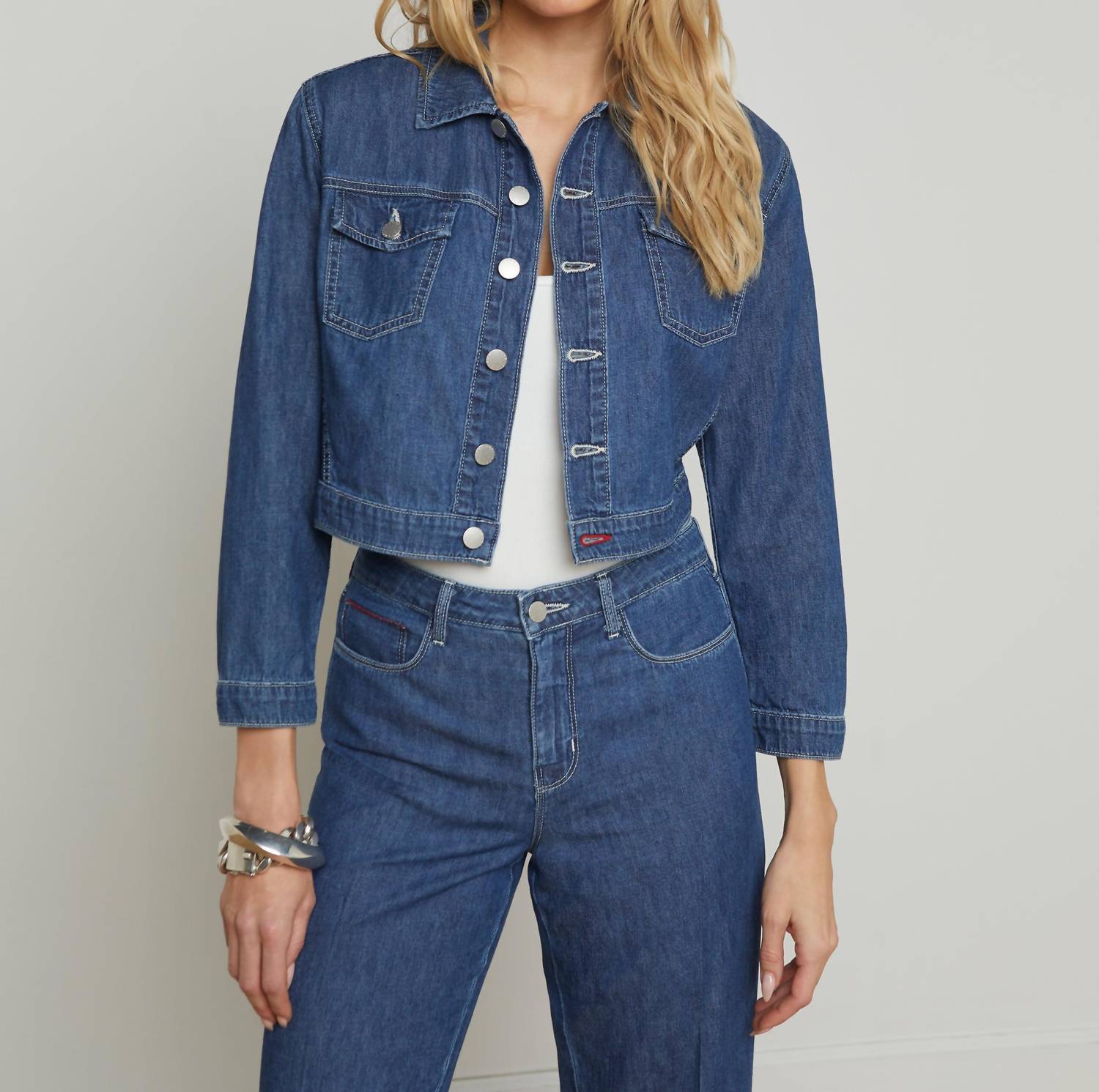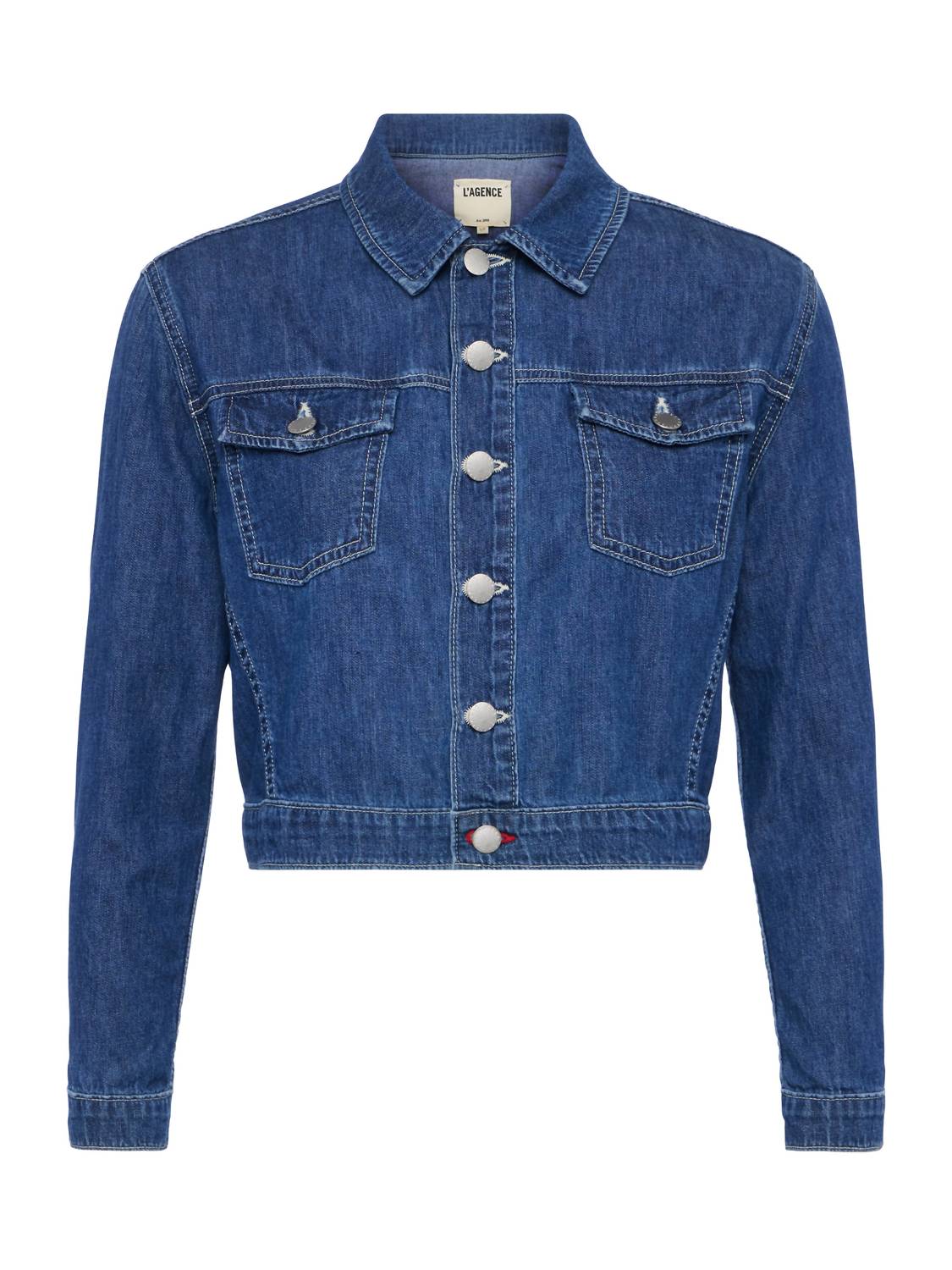 Introducing the L'Agence Koda Cropped Denim Jacket in Spokane, a perfect blend of classic style and modern edge. This women's jean jacket features long sleeves and a collar, crafted from solid cotton for durability and comfort. With a practical button closure and convenient pockets, it becomes a timeless staple for any wardrobe. Care instructions include machine wash and tumble dry, ensuring easy maintenance.