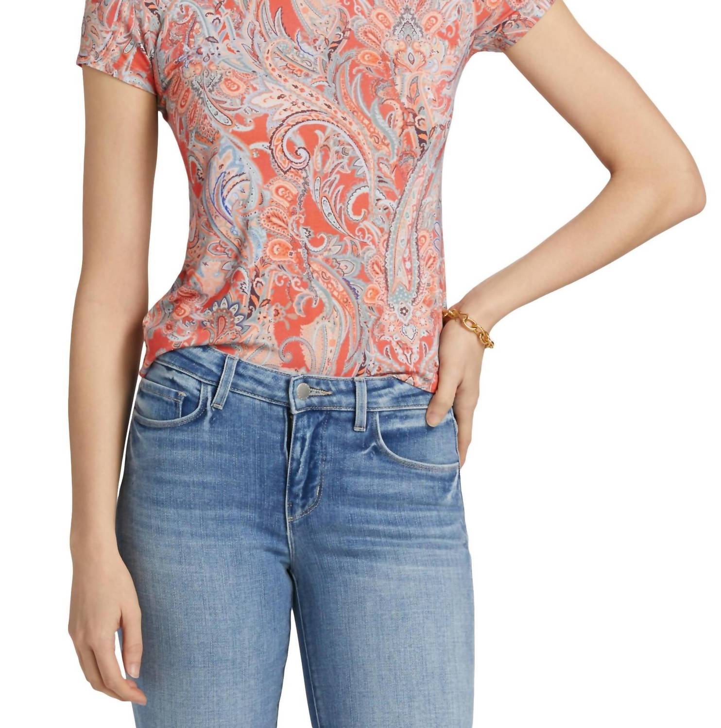 This classic, short sleeve tee will be your go-to staple this season and beyond. Embrace sophistication with the Ressi Short Sleeve Crew Tee by L'Agence, featuring a striking paisley pattern. This women's tee offers short sleeves and a crewneck design, crafted from luxurious 92% Rayon and 8% Spandex for a form-fitting silhouette. Made in Los Angeles, it is perfect for vacation-ready ensembles with its pull-on closure. Care instructions suggest hand washing for lasting quality.