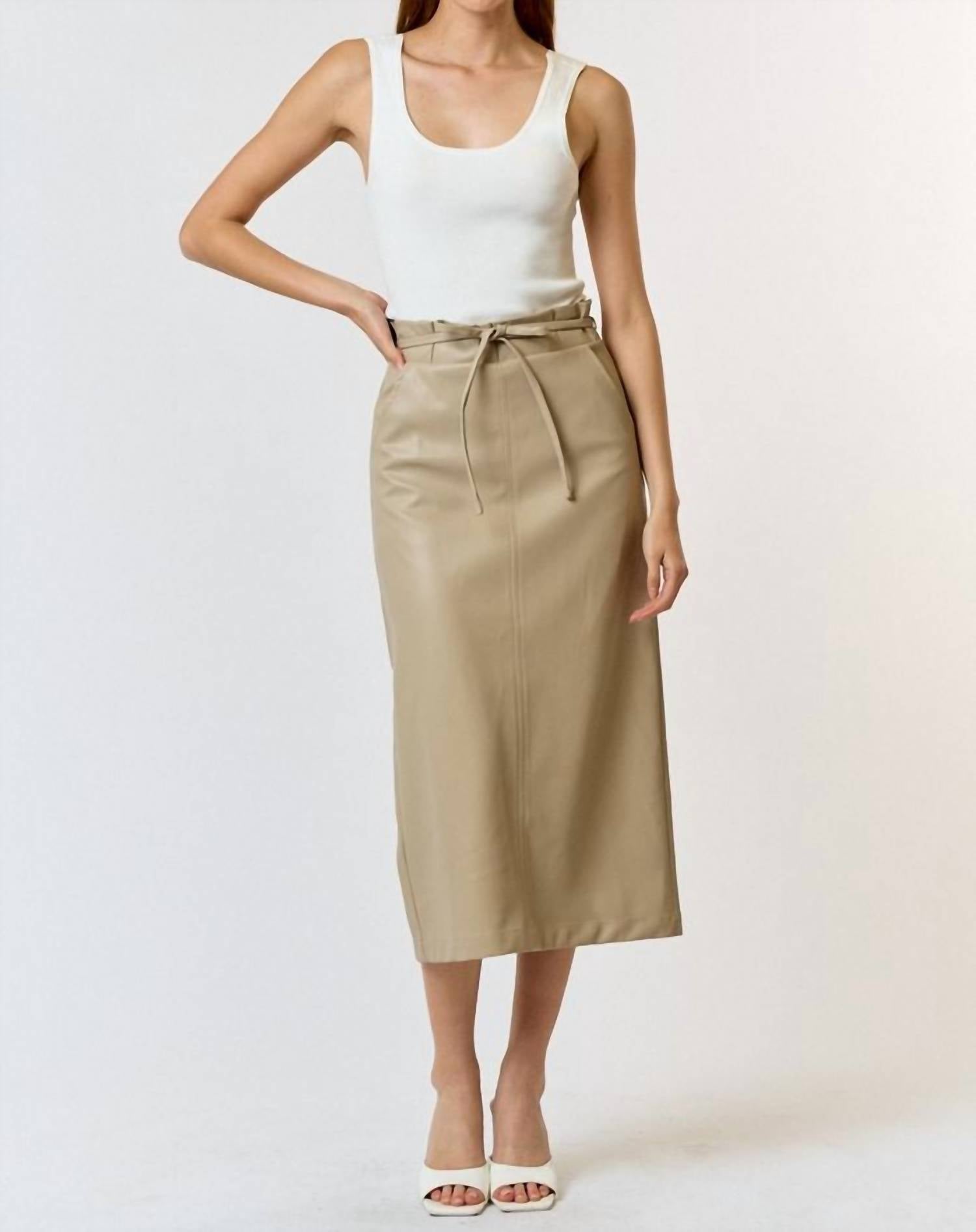 Show off just the right amount of skin in this beautifuly designed midi length skirt. Introducing the Polyurethane Leather Waist Tie Midi Skirt by Lalavon, a chic addition to your summer wardrobe in a versatile taupe hue. Crafted with a composition of 55% polyester and 45% PU, this skirt is both stylish and durable. Designed as a solid pattern midi skirt, it features convenient pockets and a secure zip closure. Made in China, this skirt provides effortless elegance for any occasion.