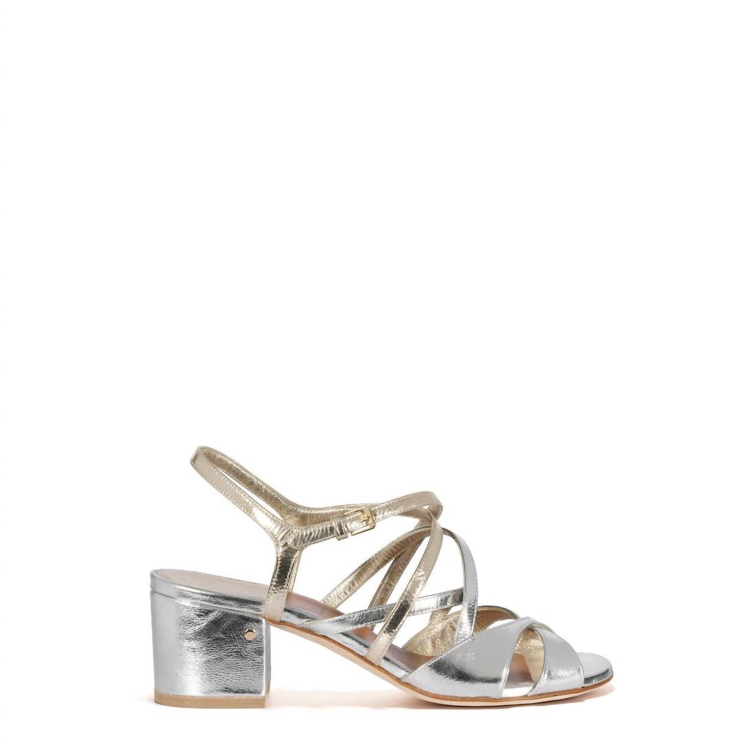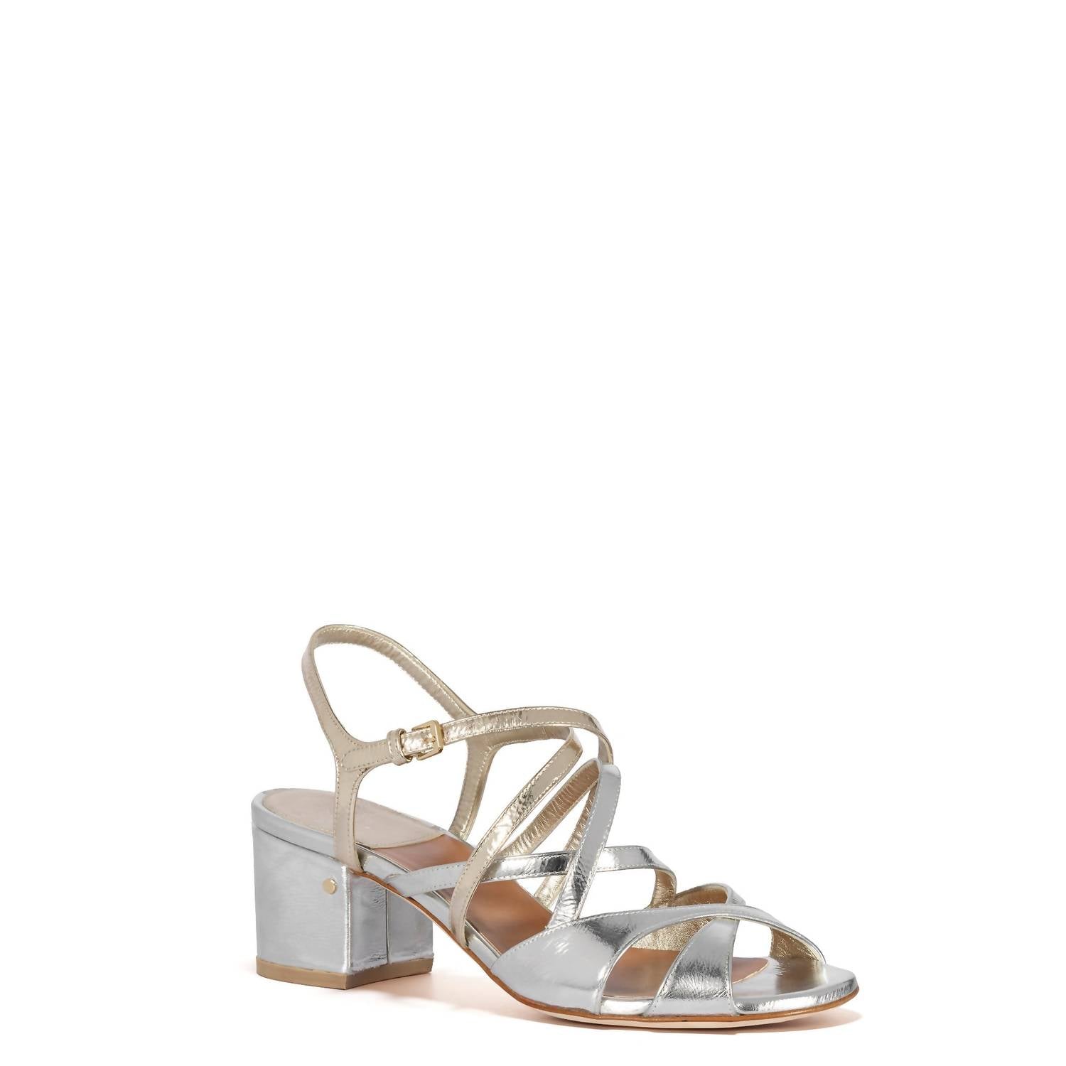 Flowy dresses, cropped pants, and even jumpsuits... this sandal works with them all! Step into elegance with the JANET Bi-color Metallic Leather Sandals by LAURENCE DACADE, perfect for any sophisticated occasion. These sandals feature a chic strappy leather upper in a striking silver and platine two-tone design. With a secure buckle clasp closure and a comfortable block heel measuring approximately 50mm (2 inches), these sandals blend style and functionality. The leather sole and logo-embossed insole add a luxurious touch, making them an ideal choice for spring dinner parties and workwear.