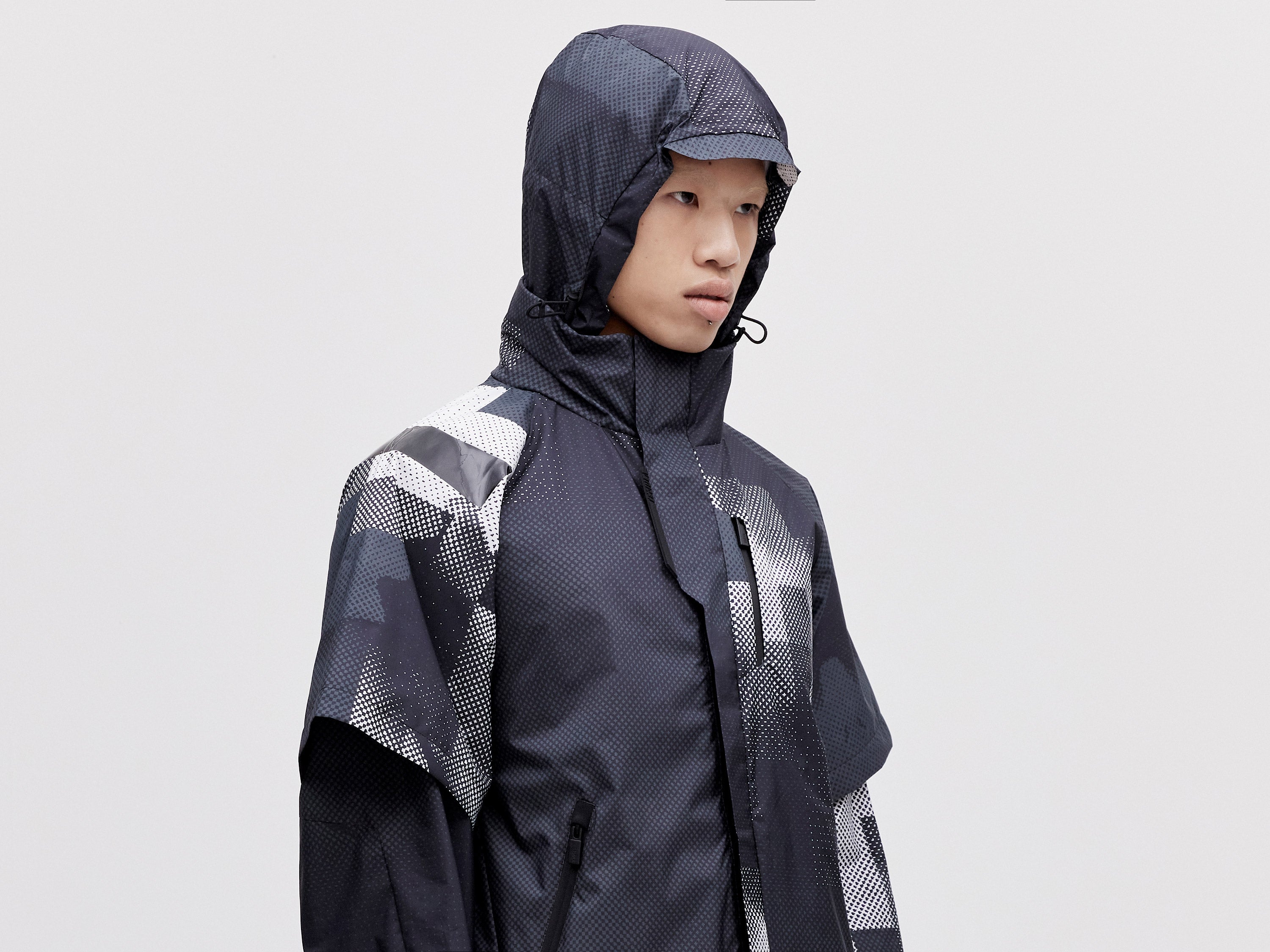A lightweight all-weather shell jacket featuring a packable hood and ventilated armholes. Our Layered 2L Jacket is designed to fully integrate with our Modular Down Vest. Simply zip the jacket onto the hidden zips of the front placket of our Modula Down Vest for added warmth and protection against the elements.