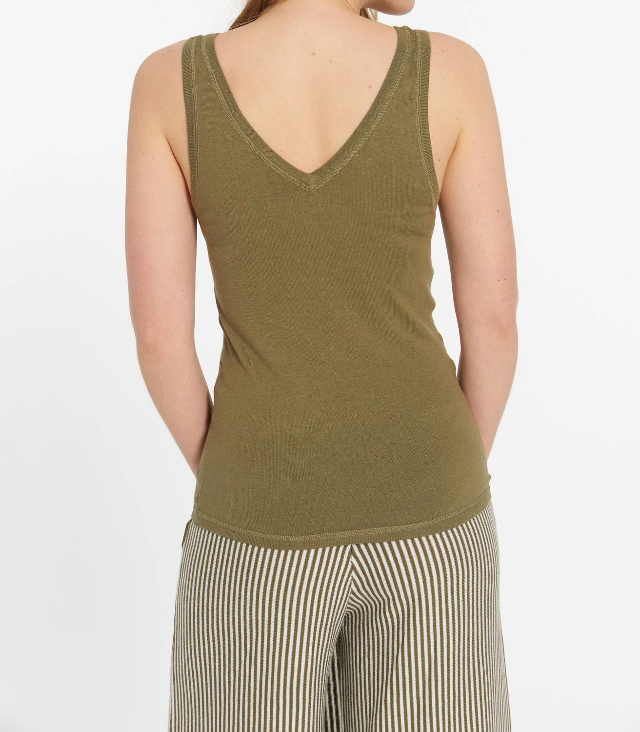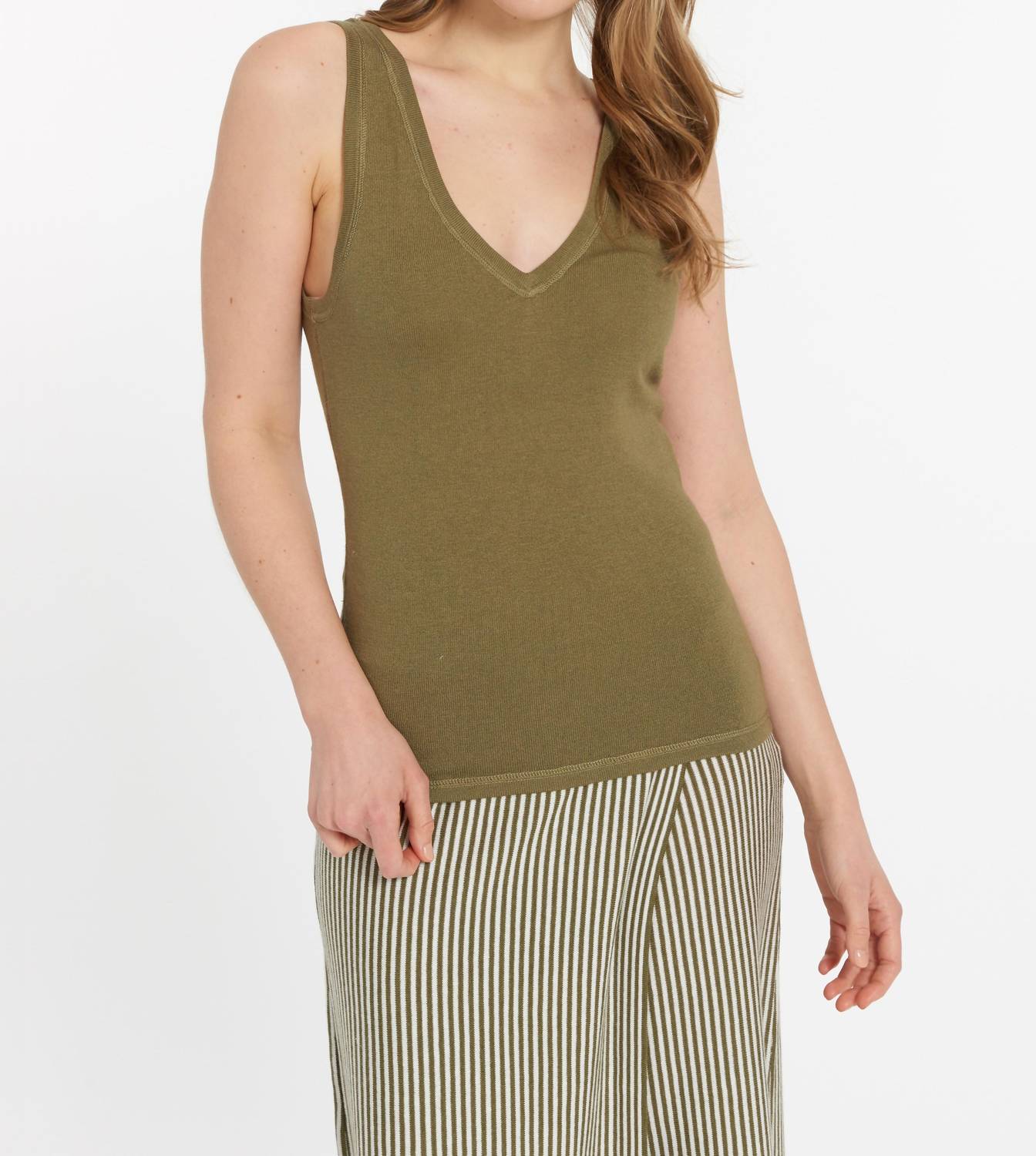 This classic tank top is perfect for layering and cute enough to wear on its own. Introducing the Sonoma Tank by LEIMERE, a must-have addition in Olive for your summer wardrobe. This sleeveless, solid-colored tank features a chic V-neck design, perfect for transitioning from work to weekend effortlessly. Crafted from a luxurious blend of 50% Modal, 25% Cotton, 15% Nylon, and 10% Cashmere, this imported tank offers unmatched comfort and durability. Closure is pull-on, with suggested care as hand wash and lay flat to dry; machine wash gentle cycle and tumble dry low are also possible for added convenience. Model is shown wearing a size small (5'9" height, 29" chest, 23.75" length).