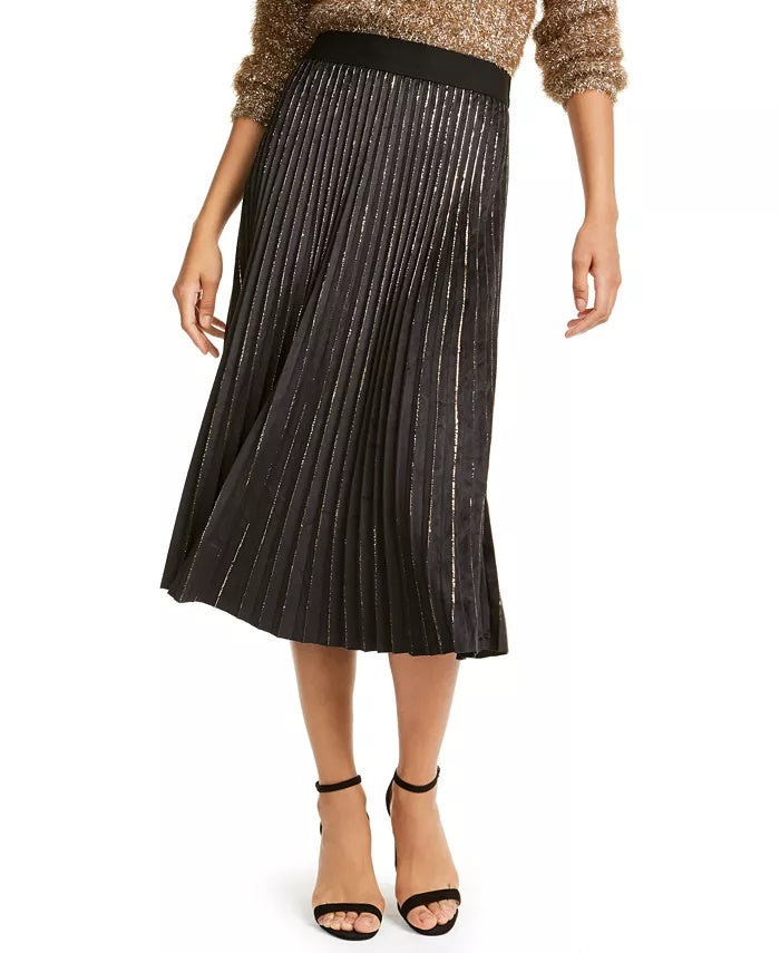 Maxi length|Pull-on styling; elastic waistband|Allover pleated velvet and metallic detail|Unlined|Polyester/spandex|Hand wash