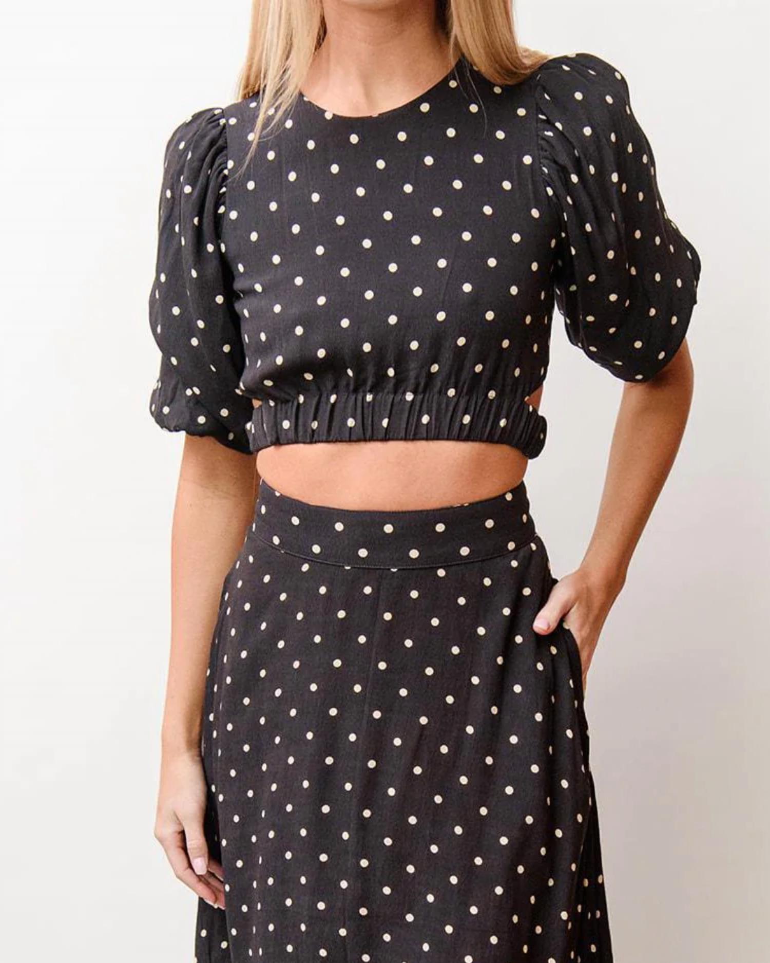 Pair this crop top with your favorite high-waisted jeans or maxi skirt. Introducing the Elanor Top by LUSANA, a chic addition to any wardrobe with its short balloon sleeves and sophisticated navy polka dot pattern. Crafted from 100% Viscose Crepe Georgette, this top features a cropped length and a button back closure, creating a flattering silhouette. Perfect for spring occasions like dinner parties, its fabric is renowned for breathability and a light texture that enhances drape and flow. Care for this stylish piece by machine washing in cold water, air drying, and ironing on low if necessary. Model stands at 5'9" and wears a size XS.