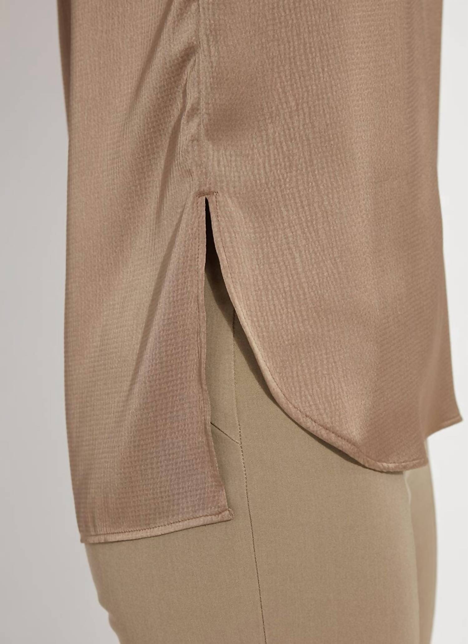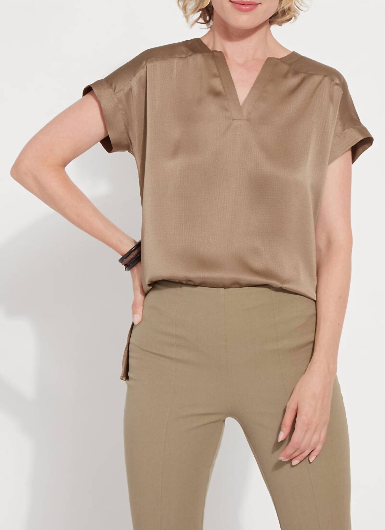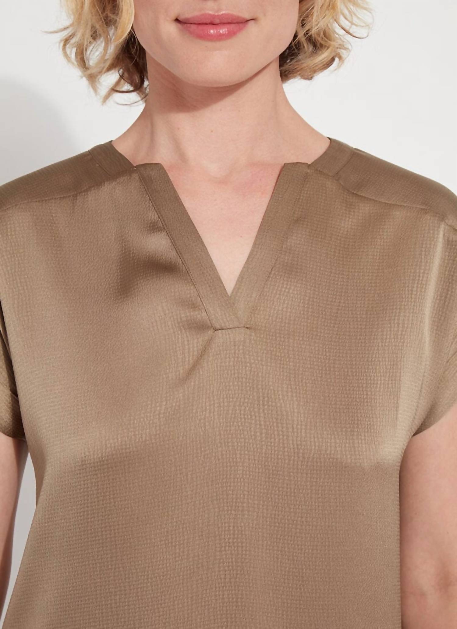 A timeless blouse that will never go out of style. Elevate your wardrobe with the Coraline V-Neck Pull On Top by Lysse in a sophisticated Olive Leaf hue. This women's blouse showcases short sleeves with a broad sleeve band, complemented by a stylish V-neck and drop shoulder design. Crafted from 98% Hammered Silk-Touch Satin and 2% Spandex, it offers a luxurious texture with a two-way stretch for comfort. Closure: Pull-on style for easy wearing. Care: Machine wash and line dry. Model is 5’10”, wearing size true to fit.
