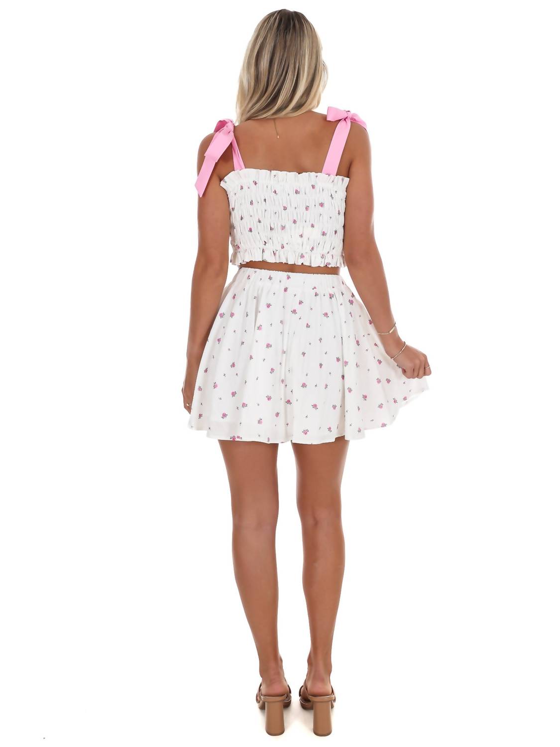A set so cute you'll never want to take it off. Designed to look good while lounging, this little number is the perfect outfit for hanging at home in style. Indulge in feminine charm with the Bloom & Blush Two Piece Set by MABLE, a chic addition to any wardrobe. This sleeveless set showcases a stunning floral pattern over a cream backdrop, perfect for spring vacations or Valentine's Day. The ensemble features a squareneck smocked crop top, complemented by a flirty mini skirt with an invisible zip closure for added convenience. Designed for women and lined for comfort, this set epitomizes effortless style.