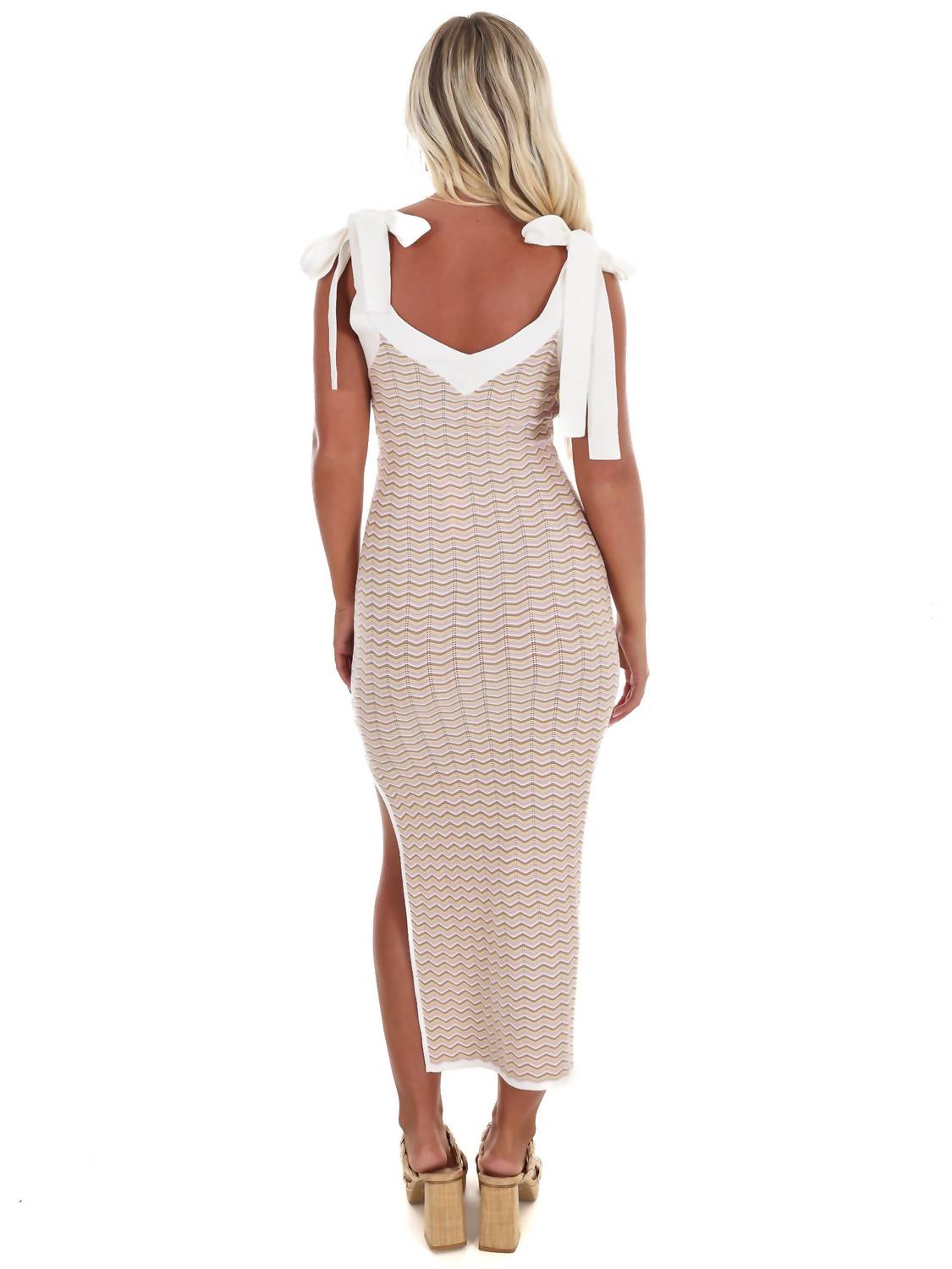 The perfect length dress does exist. Introducing the Wave Runner Chevron Bodycon Midi Dress by MABLE, a stylish choice for a dinner party. This sleeveless dress, in a textured taupe multi-colored pattern, features a ribbed design with a flattering v-neck and pull-on closure. The midi length and side slit detail deliver a chic, on-trend look, perfect for showcasing quiet luxury. Make a bold statement in this must-have piece made for spring.