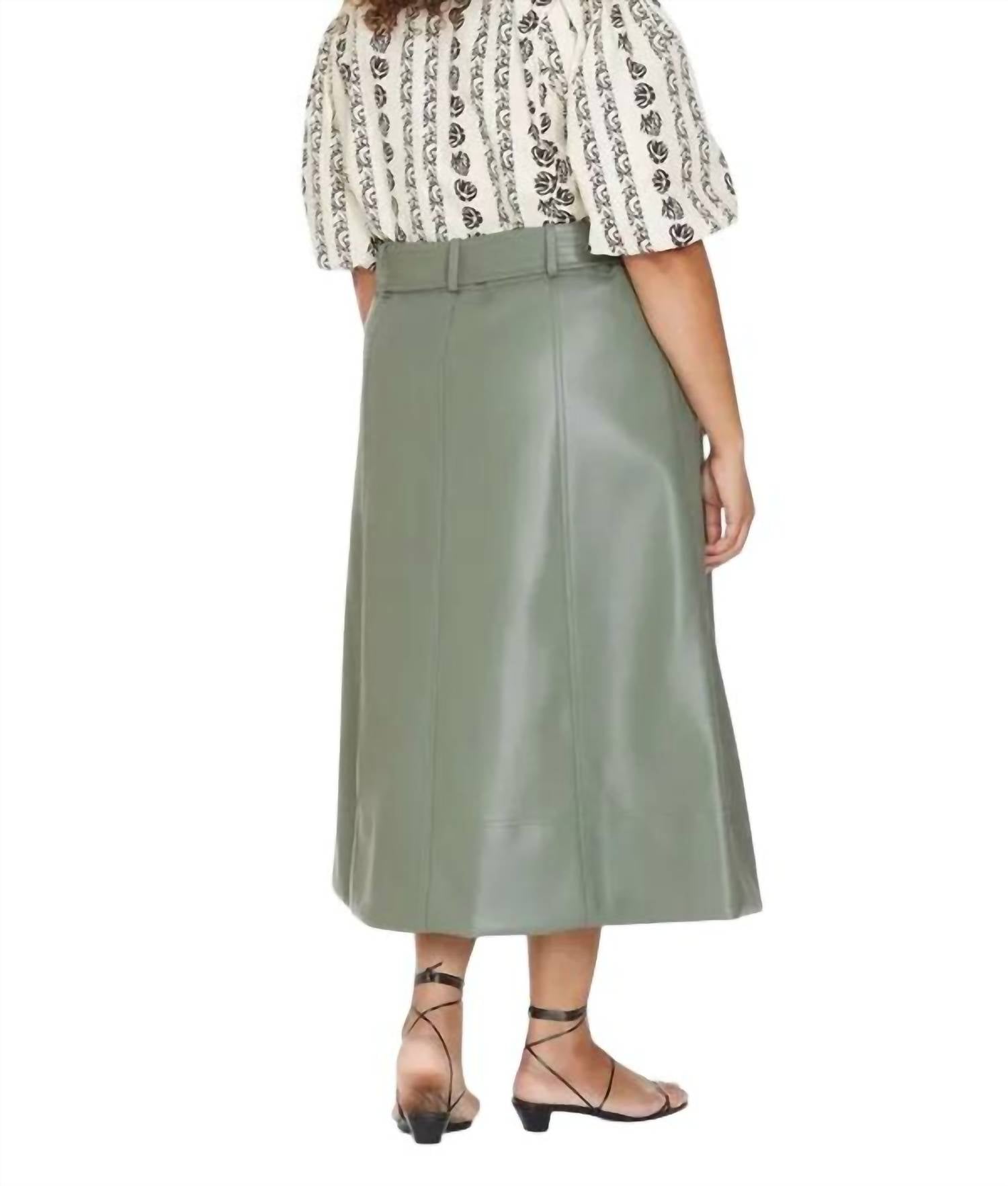 Show off just the right amount of skin in this beautifuly designed midi length skirt. Step into elegance with the Marie Oliver Greenwich Vegan Leather Skirt in a striking Fern hue, designed to capture the essence of quiet luxury. This midi-length skirt, made from 100% polyester faux leather, boasts a solid pattern and an A-line panel silhouette, complete with an optional tie belt and a convenient zip closure. Perfect for a dinner party or an evening out, it pairs beautifully with blouses and sweaters, making it a versatile addition to your fall wardrobe. Care is simple with spot cleaning, allowing you to maintain its modern charm effortlessly.