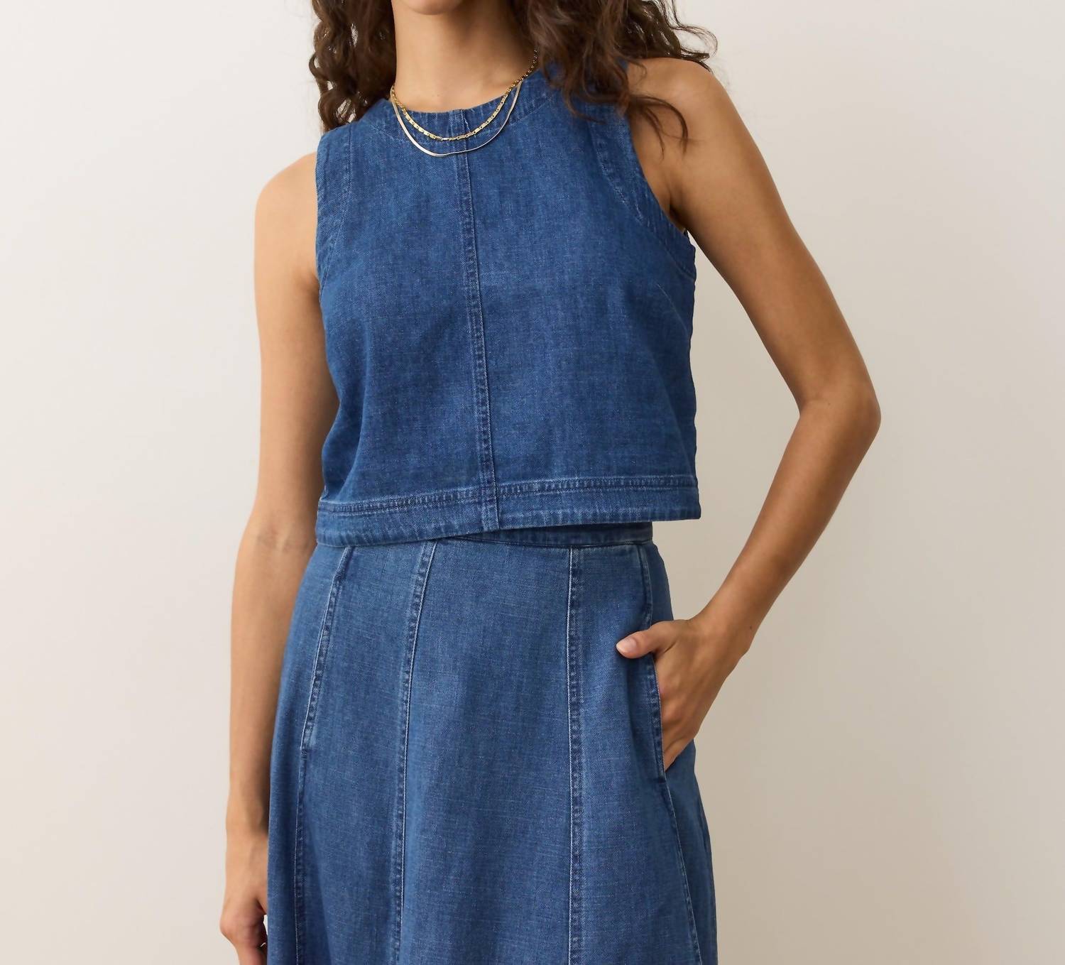 This classic tank top is perfect for layering and cute enough to wear on its own. Embrace effortless chic with the Quinn Denim Tank by Marine Layer, perfect for a day out in a medium wash. This sleeveless high neck tank features a relaxed fit and cropped length for a modern silhouette. Crafted from 100% cotton, it includes subtle denim seam details for added style and a convenient zipper back with pull closure. Proudly made in China, it offers easy care with machine wash cold and tumble dry low instructions.