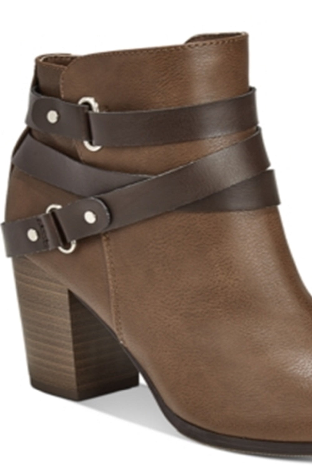 Buckled straps add shine to the mixed-media design of Material Girl's Melany booties for a fun look that dresses up or down with a hint of western flair.| 2-3/4 block heel| Round-toe ankle booties with zipper closure| Buckled strap hardware details at ankle| Cushioned insole for added comfort| | Manmade upper; manmade sole