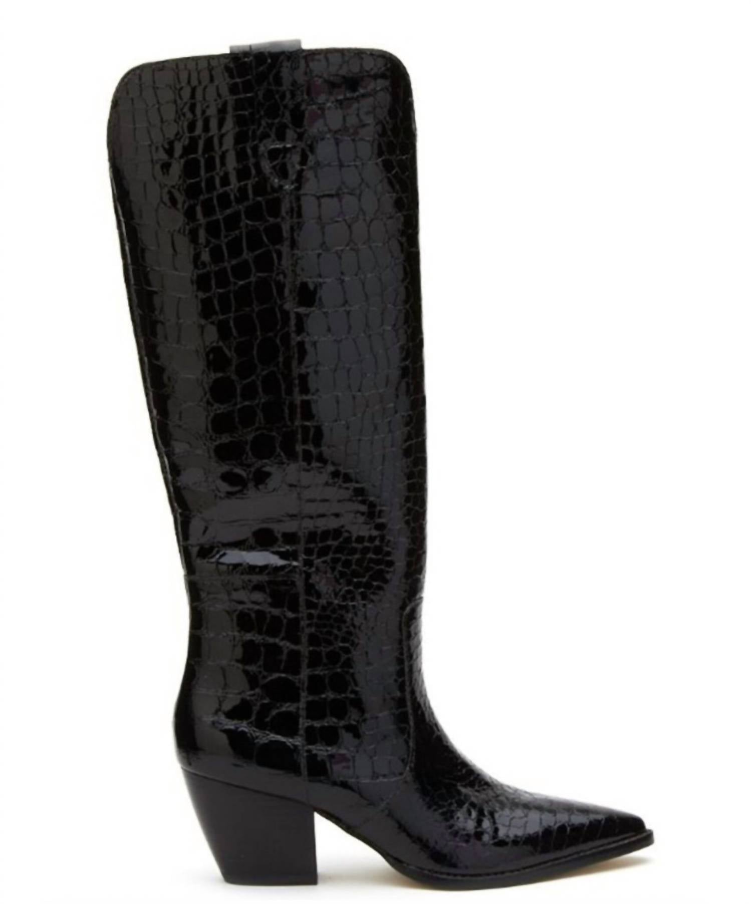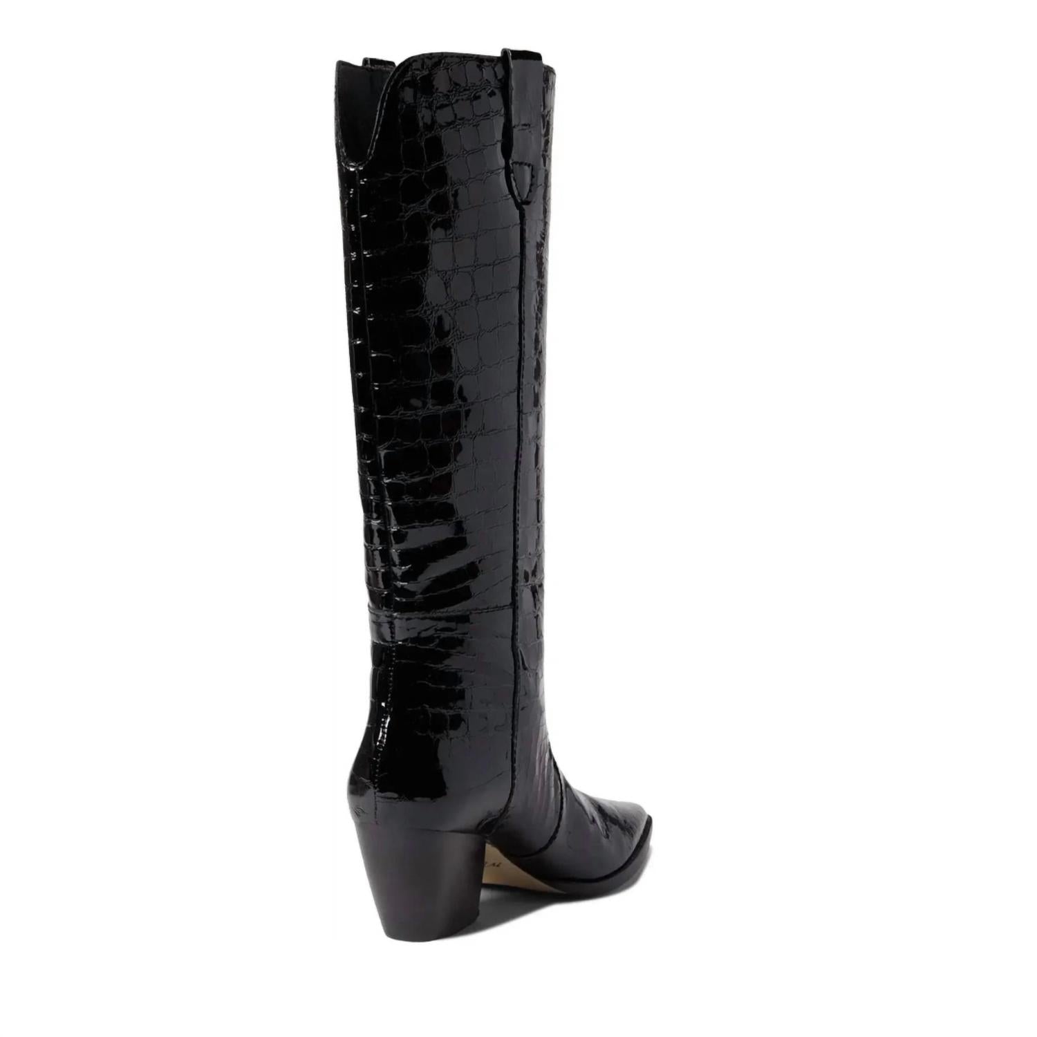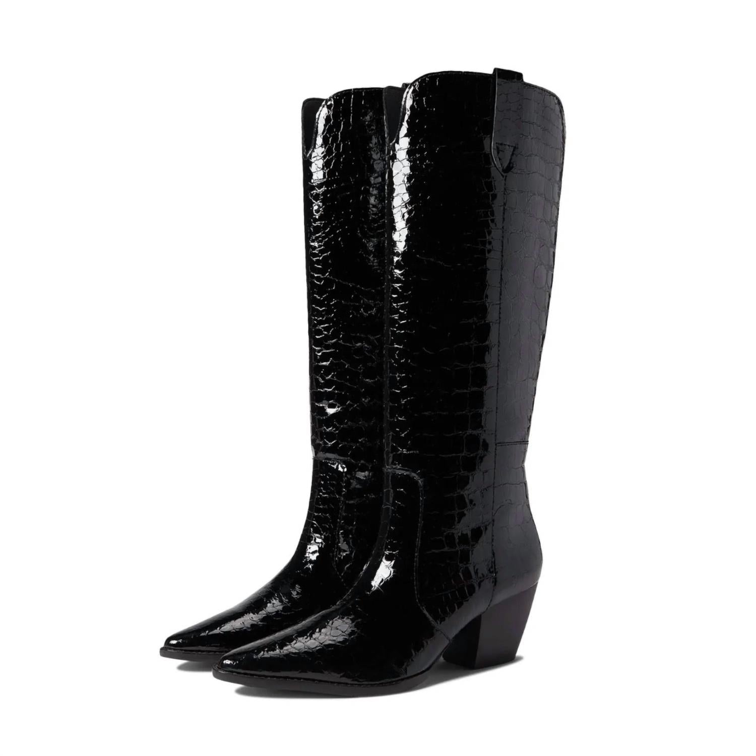 Made with crocodile-textured leather, the Stella boot will take your style to the next level! Step out in this sleek black version for a chic and edgy look - and become a footwear fashionista. Genuine leather. Pull tabs. Pointed toe. Leather lining. Cushioned footbed. Leather outsole with rubber heel cap. Western heel. Handcrafted by highly skilled boot artisans. True to size.