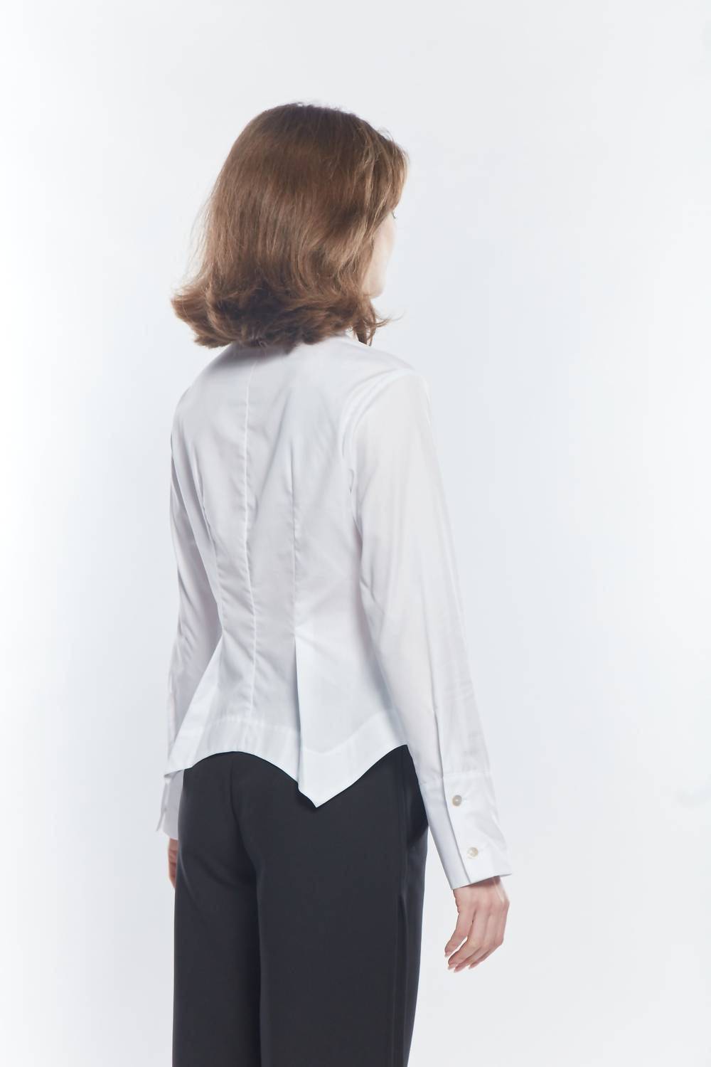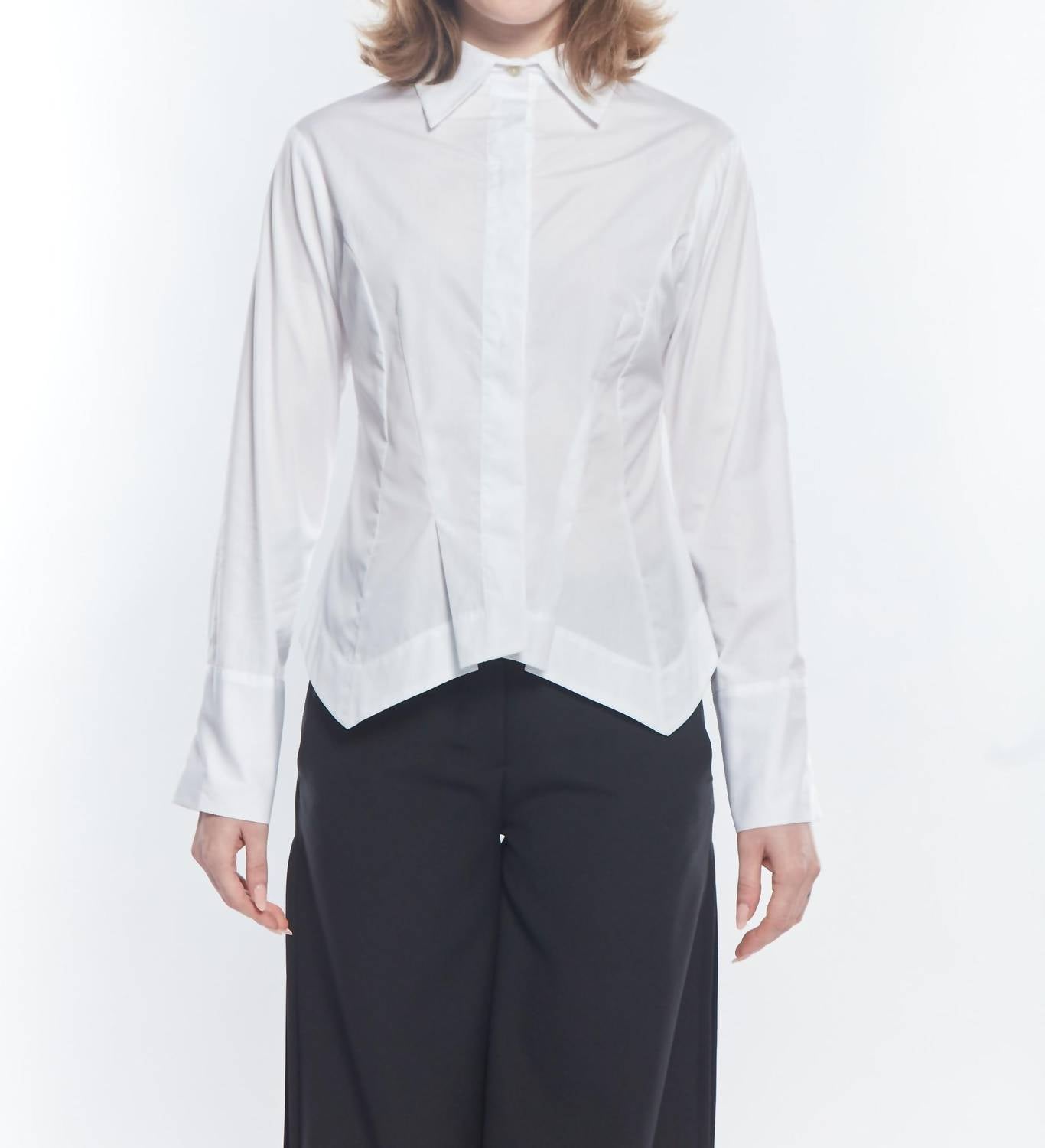 A classic button down shirt that will never go out of style. Discover the Beam Pleated Button Down Shirt by Matthildur, a sophisticated staple crafted from crisp white Pima cotton. This women’s button down features long sleeves and a collar, with a distinctive scalloped bottom and asymmetric detailing that exudes modern elegance. Closure: Button closure. Care: Machine wash and tumble dry.