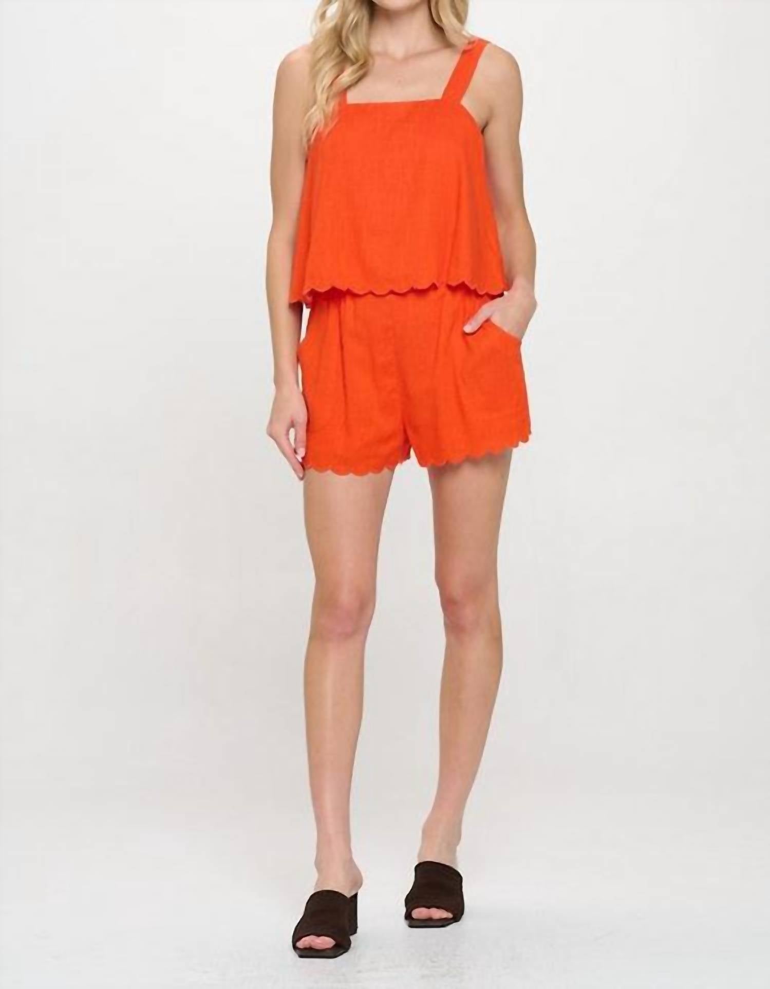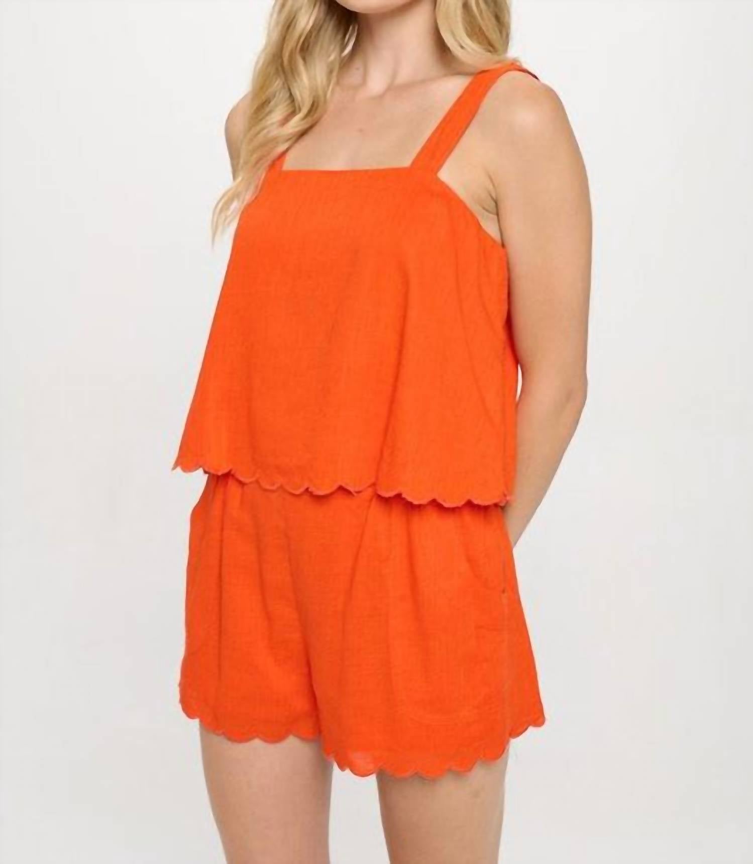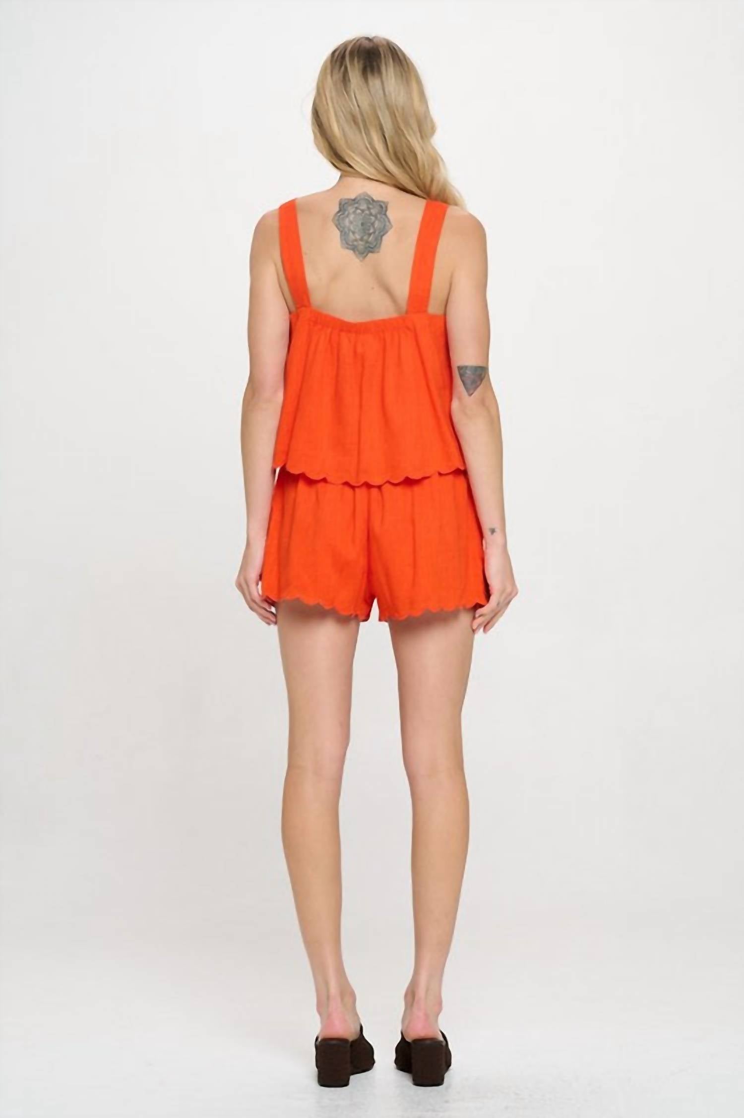 Fit, fabric and functionality. This tank top checks all the boxes. Embrace the summer vibes with the Sunset Glow Scalloped Set by Meet Me in Santorini. This sleeveless set, made from breezy woven cotton, features a square neck tank top and high-waisted shorts with a relaxed fit and wide straps. Both pieces are adorned with delicate scalloped hems, while the shorts include side pockets and an elastic waistband for comfort. This minimalist set in a solid vibrant color is perfect for beach days or any warm-weather occasion.