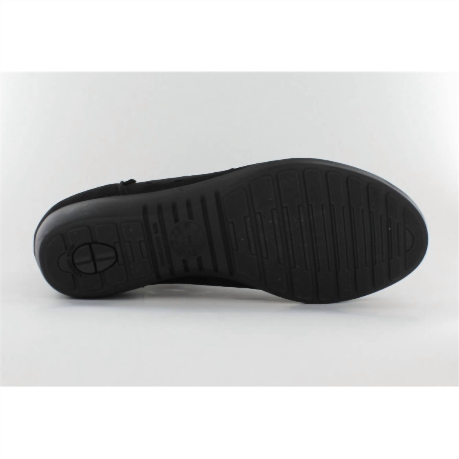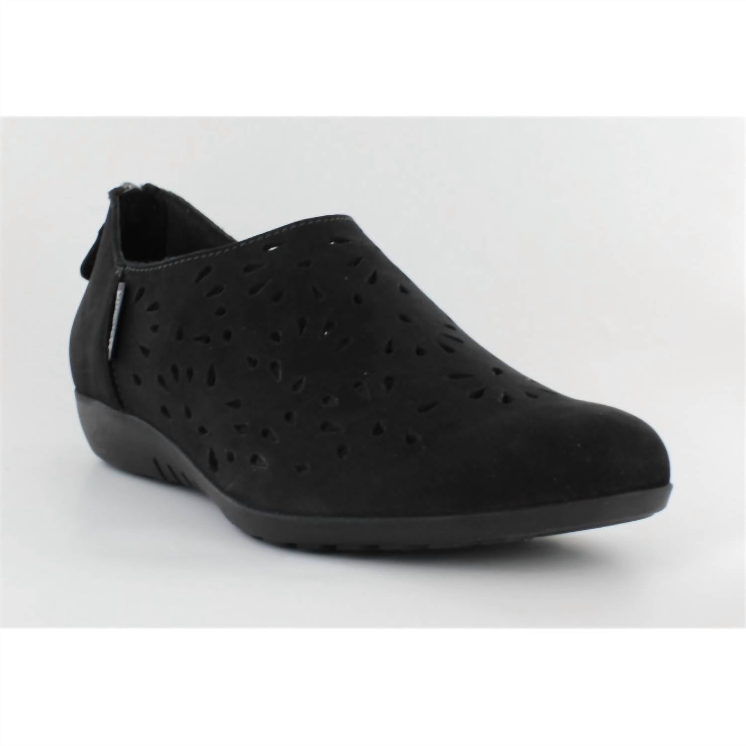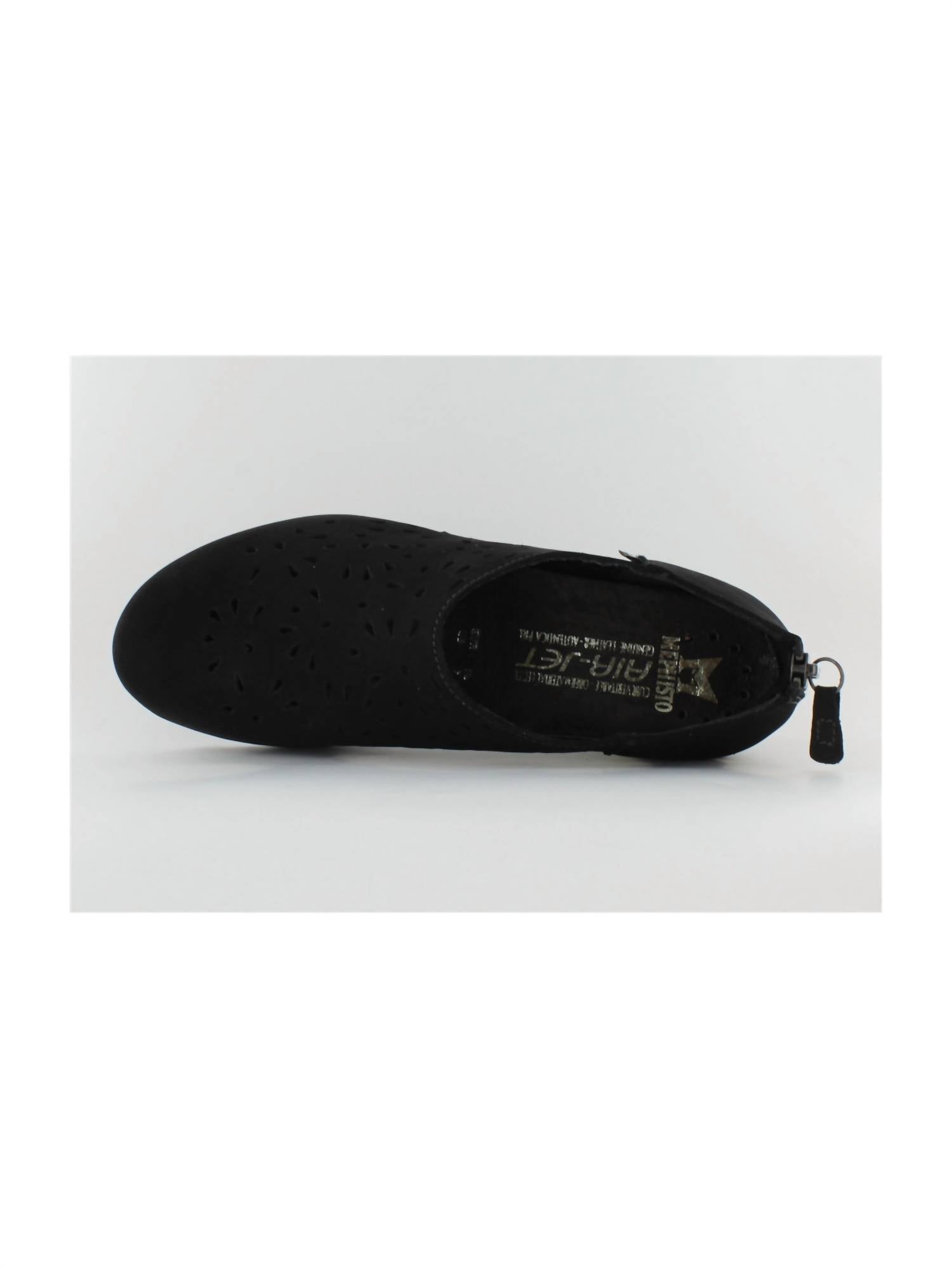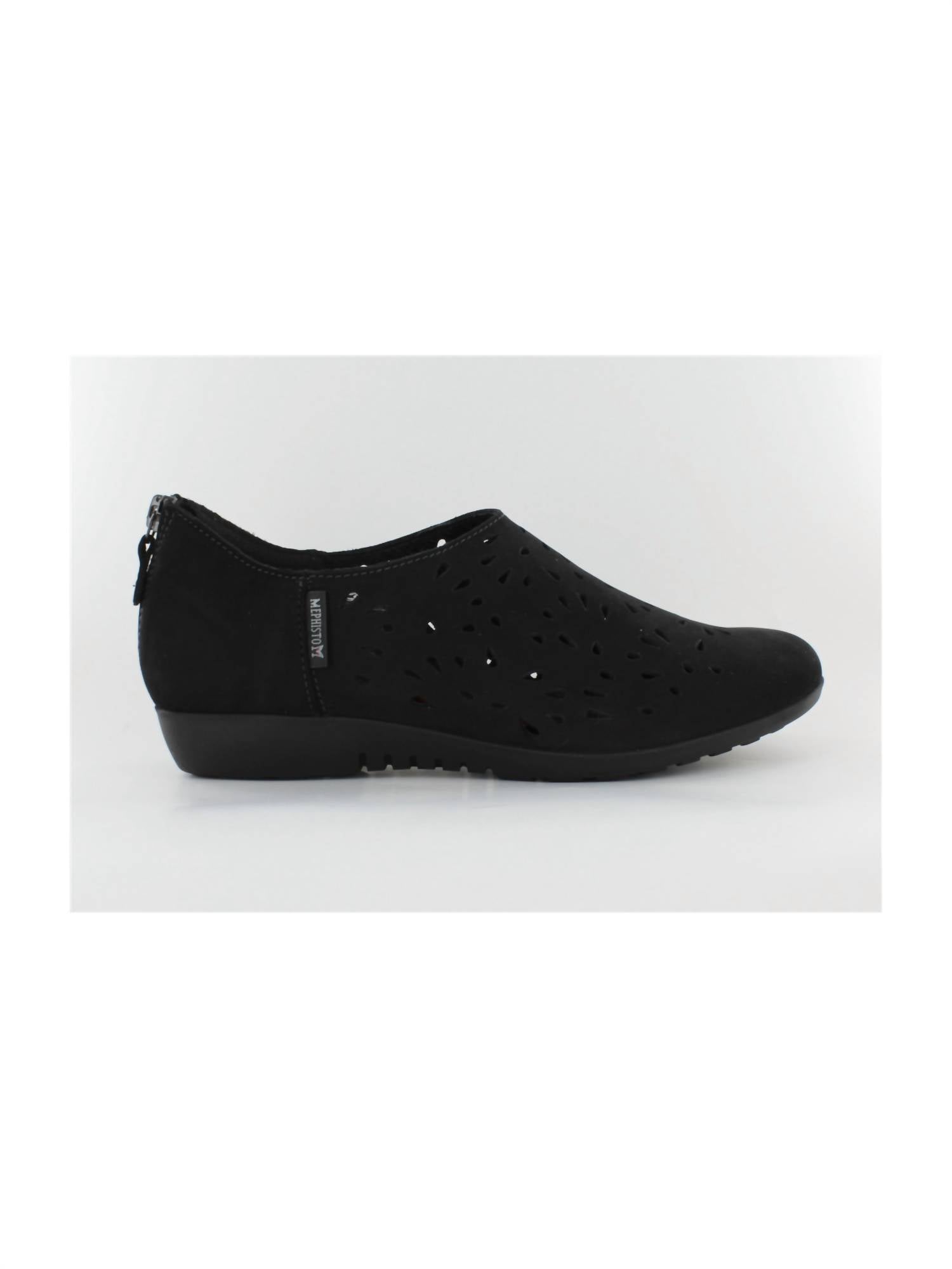 A classic loafer that is both comfortable and polished. Step into comfort with the Women's Dina Shoes by MEPHISTO, crafted in black faux leather for a chic minimalist style. These flats feature an almond toe design and a convenient zipper closure, perfect for easy wear during vacation-ready spring outings. The teardrop-shaped perforations add a touch of elegance, while the removable sole allows for orthotic customization. Ideal for women seeking both style and practicality, these shoes offer all-day comfort with their flat heel under 1 inch.