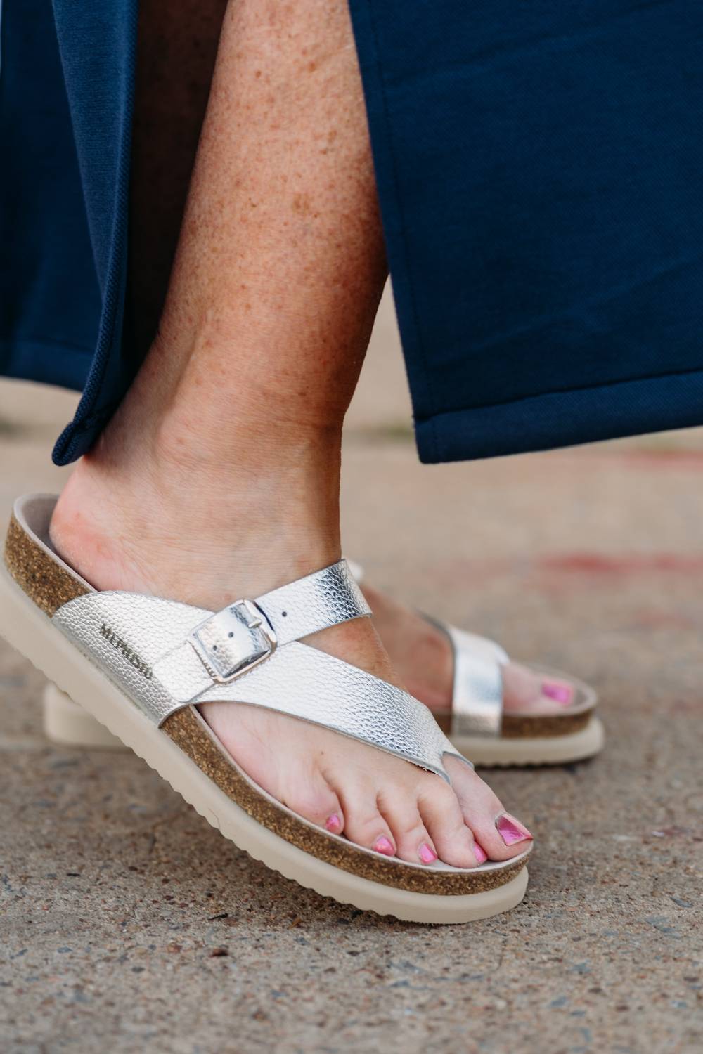 Flowy dresses, cropped pants, and even jumpsuits... this sandal works with them all! Discover the Women's Helen Sandals by Mephisto, designed in an elegant silver color for both comfort and style. These sandals feature an open toe design with a flat heel, perfect for daily wear. Originating from an unspecified country, they boast adjustable straps and a shock-absorbing sole for all-day cushioning. Suitable for adult women, indulge in luxury with every step.